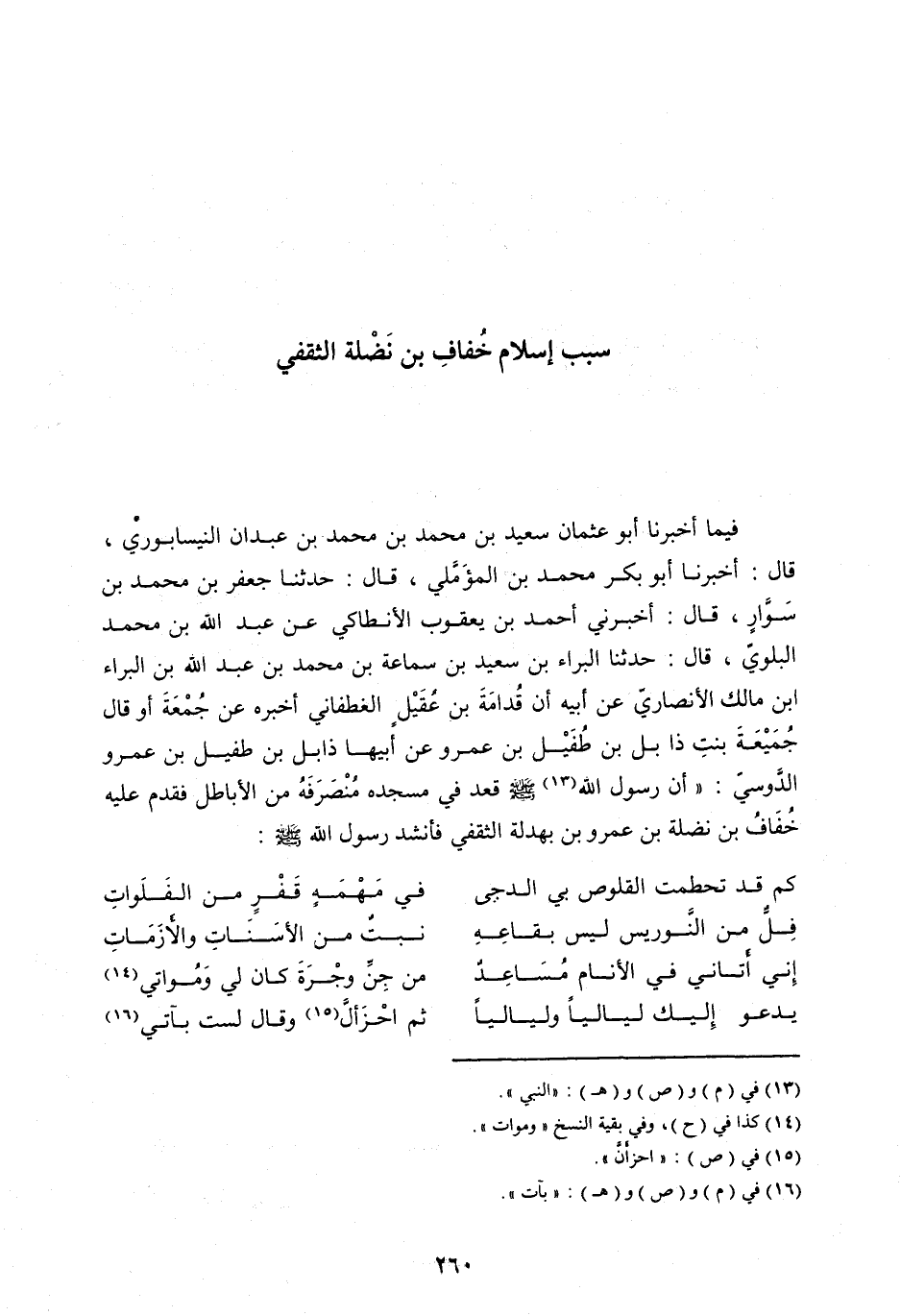 فِيمَا أَخْبَرَنَا أَبُو عُثْمَانَ سَعِيدُ بْنُ مُحَمَّدِ بْنِ مُحَمَّدِ بْنِ عَبْدَانَ النَّيْسَابُورِيُّ، قَالَ: أَخْبَرَنَا أَبُو بَكْرٍ مُحَمَّدُ بْنُ الْمُؤَمَّلِيُّ، قَالَ: حَدَّثَنَا جَعْفَرُ بْنُ مُحَمَّدِ بْنِ سَوَّارٍ، قَالَ: أَخْبَرَنِي أَحْمَدُ بْنُ يَعْقُوبَ الْأَنْطَاكِيُّ عَنْ عَبْدِ اللهِ بْنِ مُحَمَّدٍ الْبَلَوِيِّ، قَالَ: حَدَّثَنَا الْبَرَاءُ بْنُ سَعِيدِ بْنِ سَمَاعَةَ بْنِ مُحَمَّدِ بْنِ عَبْدِ اللهِ بن البراء ابن مَالِكِ الْأَنْصَارِيُّ عَنْ أَبِيهِ أَنَّ قُدَامَةَ بْنَ عَقِيلٍ الْغَطَفَانِيَّ أَخْبَرَهُ عَنْ جُمُعَةَ أَوْ قَالَ جُمَيْعَةَ بِنْتِ ذا بل بْنِ طُفَيْلِ بْنِ عَمْرٍو عَنْ أَبِيهَا ذَابِلِ بْنِ طُفَيْلِ بْنِ عَمْرٍو الدَّوْسِيِّ: «أَنَّ رَسُولَ الله [ (13) ] صلى الله عليه وآله وَسَلَّمَ قَعَدَ فِي مَسْجِدِهِ مُنْصَرَفَهُ مِنَ الْأَبَاطِلِ فَقَدِمَ عَلَيْهِ خُفَافُ بْنُ نَضْلَةَ بْنِ عَمْرٍو بن بَهْدَلَةَ الثَّقَفِيُّ فَأَنْشَدَ رَسُولَ اللهِ صَلَّى اللهُ عليه وآله وسلّم: