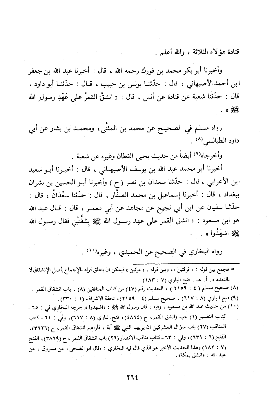 [ (10) ] مِنْ حَدِيثِ عَبْدِ اللهِ بن مسعود، وفِيهِ: قَالَ رَسُولُ اللهِ صَلَّى اللهُ عَلَيْهِ وآله وسلّم: «اشهدوا» أخرجه البخاري في: 65- كتاب التفسير (1) باب وانشق القمر، ح (4864) ، فتح الباري (8: 617) ، وفي: 61- كتاب المناقب (27) باب سؤال المشركين ان يريهم النبي صلى الله عليه وآله وسلّم آيَةً، فَأَرَاهُمُ انْشِقَاقَ الْقَمَرِ، ح (3626) ، الفتح (6: 631) ، وفي: 63- كتاب مناقب الأنصار (26) باب انشقاق القمر، ح (3869) ، الفتح (7: 182) وهذا الحديث الأخير هو الذي قال فيه البخاري: «قال ابو الضُّحَى، عَنْ مَسْرُوقٍ، عَنْ عَبْدِ اللهِ: «انْشَقَّ بمكة» .