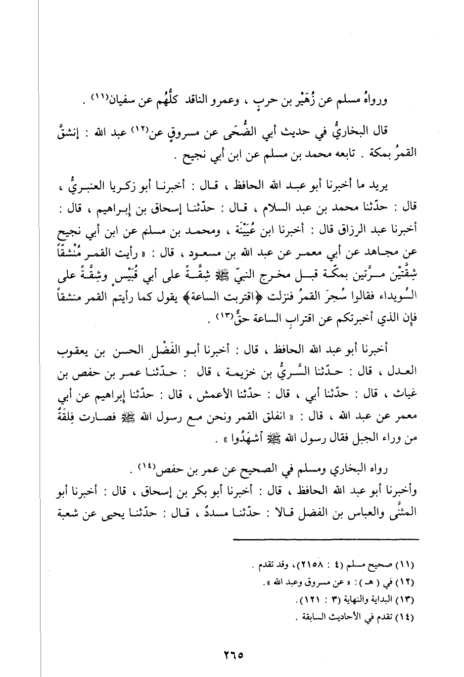 أَخْبَرَنَا أَبُو عَبْدِ اللهِ الْحَافِظُ، قَالَ: أَخْبَرَنَا أَبُو الْفَضْلِ الْحَسَنُ بْنُ يَعْقُوبَ الْعَدْلُ، قَالَ: حَدَّثَنَا السّريُّ بْنُ خُزَيْمَةَ، قَالَ: حَدَّثَنَا عُمَرُ بْنُ حَفْصِ بْنِ غِيَاثٍ، قَالَ: حَدَّثَنَا أَبِي، قَالَ: حَدَّثَنَا الْأَعْمَشُ، قَالَ: حَدَّثَنَا إِبْرَاهِيمُ عَنْ أَبِي مَعْمَرٍ عَنْ عَبْدِ اللهِ، قَالَ: «انْفَلَقَ الْقَمَرُ ونَحْنُ مَعَ رَسُولِ اللهِ صَلَّى اللهُ عَلَيْهِ وآله وَسَلَّمَ فَصَارَتْ فِلْقَةٌ مِنْ وَرَاءِ الْجَبَلِ فَقَالَ رَسُولُ اللهِ صَلَّى الله عليه وآله وَسَلَّمَ اشْهَدُوا» .