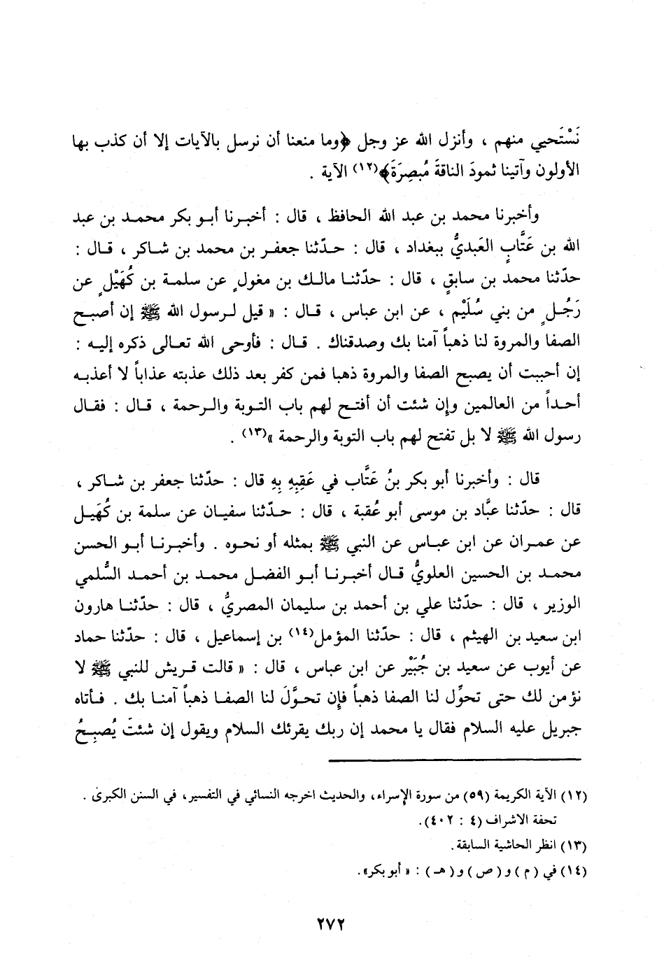 قَالَ: وَأَخْبَرَنَا أَبُو بَكْرِ بْنُ عَتَّابِ فِي عَقِبِهِ بِهِ قَالَ: حَدَّثَنَا جَعْفَرُ بْنُ شَاكِرٍ، قَالَ: حَدَّثَنَا عَبَّادُ بْنُ مُوسَى أَبُو عُقْبَةَ، قَالَ: حَدَّثَنَا سُفْيَانُ عَنْ سَلَمَةَ بْنِ كُهَيْلٍ عَنْ عِمْرَانَ عَنِ ابْنِ عَبَّاسٍ عَنِ النَّبِيِّ صَلَّى اللهُ عليه وآله وَسَلَّمَ بِمِثْلِهِ أَوْ نَحْوِهِ. وأَخْبَرَنَا أَبُو الْحَسَنِ مُحَمَّدُ بْنُ الْحُسَيْنِ الْعَلَوِيُّ قَالَ أَخْبَرَنَا أَبُو الْفَضْلِ مُحَمَّدُ بْنُ أَحْمَدَ السُّلَمِيُّ الْوَزِيرُ، قَالَ: حَدَّثَنَا عَلِيُّ بْنُ أَحْمَدَ بْنِ سُلَيْمَانَ الْمِصْرِيُّ، قال: حدّثنا هارون ابن سَعِيدِ بْنِ الْهَيْثَمِ، قَالَ: حَدَّثَنَا الْمُؤَمَّلُ [ (14) ] بْنُ إِسْمَاعِيلَ، قَالَ: حَدَّثَنَا حَمَّادٌ عَنْ أَيُّوبَ عَنْ سَعِيدِ بْنِ جُبَيْرٍ عَنِ ابْنِ عَبَّاسٍ، قَالَ: «قَالَتْ قُرَيْشٌ لِلنَّبِيِّ صَلَّى اللهُ عَلَيْهِ وآله وَسَلَّمَ لَا نُؤْمِنُ لَكَ حَتَّى تُحَوِّلَ لَنَا الصَّفَا ذَهَبًا فَإِنْ تَحَوَّلَ لَنَا الصَّفَا ذَهَبًا آمَنَّا بِكَ. فَأَتَاهُ جِبْرِيلُ عَلَيْهِ السَّلَامُ فَقَالَ يَا مُحَمَّدُ إِنَّ رَبَّكَ يُقْرِئُكَ السَّلَامَ وَيَقُولُ إن شئت يصبح