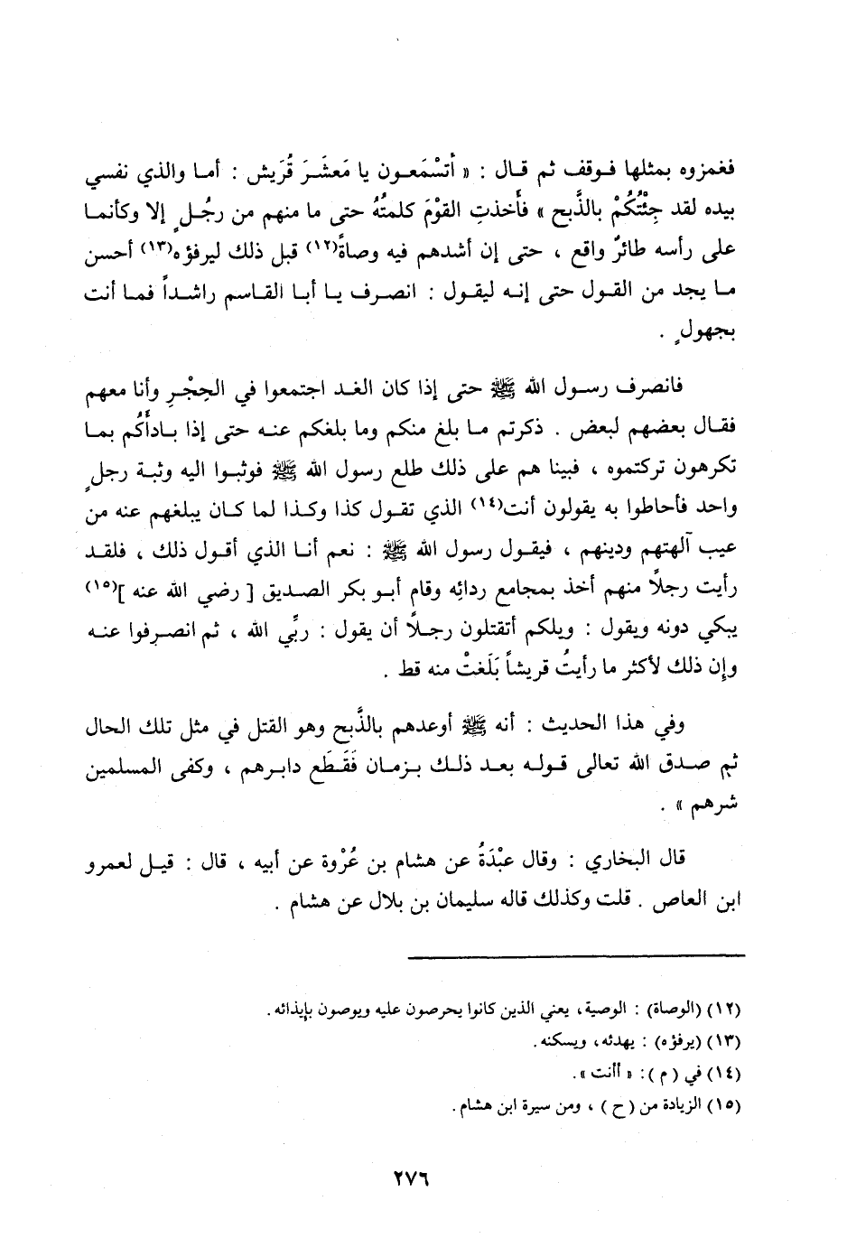 فَانْصَرَفَ رَسُولُ اللهِ صَلَّى الله عليه وآله وَسَلَّمَ حَتَّى إِذَا كَانَ الْغَدُ اجْتَمَعُوا فِي الْحِجْرِ وَأَنَا مَعَهُمْ فَقَالَ بَعْضُهُمْ لِبَعْضٍ. ذَكَرْتُمْ مَا بَلَغَ مِنْكُمْ وَمَا بَلَغَكُمْ عَنْهُ حَتَّى إِذَا بَادَأَكُمْ بِمَا تَكْرَهُونَ تركتموه، فبيناهم عَلَى ذَلِكَ طَلَعَ رَسُولُ اللهِ صَلَّى اللهُ عليه وآله وَسَلَّمَ فَوَثَبُوا إِلَيْهِ وَثْبَةَ رَجُلٍ وَاحِدٍ فَأَحَاطُوا بِهِ يَقُولُونَ أَنْتَ [ (14) ] الَّذِي تَقُولُ كَذَا وَكَذَا لِمَا كَانَ يَبْلُغُهُمْ عَنْهُ مِنْ عَيْبِ آلِهَتِهِمْ وَدِينِهِمْ، فَيَقُولُ رَسُولُ الله صلى الله عليه وآله وَسَلَّمَ: نَعَمْ أَنَا الَّذِي أَقُولُ ذَلِكَ، فَلَقَدْ رَأَيْتُ رَجُلًا مِنْهُمْ أَخَذَ بِمَجَامِعِ رِدَائِهِ