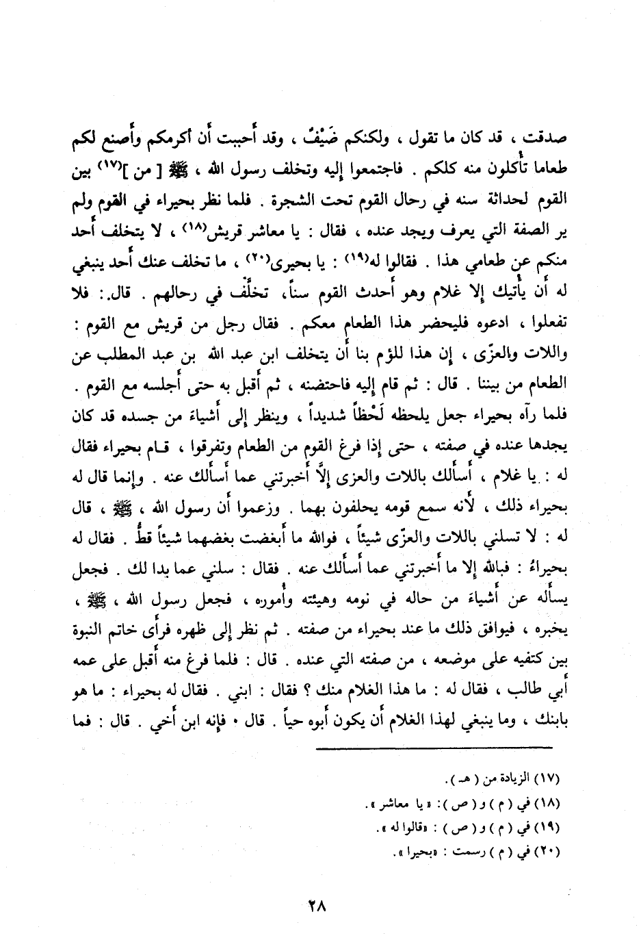 قَامَ بَحِيرَاءُ فَقَالَ لَهُ: يَا غُلَامُ، أَسْأَلُكُ بِاللَّاتِ وَالْعُزَّى إِلَّا أَخْبَرْتَنِي عَمَّا أَسْأَلُكَ عَنْهُ. وَإِنَّمَا قَالَ لَهُ بَحِيرَاءُ ذَلِكَ، لِأَنَّهُ سَمِعَ قَوْمَهُ يَحْلِفُونَ بِهِمَا. وزَعَمُوا أَنَّ رَسُولَ اللهِ، صَلَّى اللهُ عَلَيْهِ وآله وَسَلَّمَ، قَالَ لَهُ: لَا تَسَلْنِي بِاللَّاتِ وَالْعُزَّى شَيْئًا، فو الله مَا أَبْغَضْتُ بُغْضَهُمَا شَيْئًا قَطُّ. فَقَالَ لَهُ بَحِيرَاءُ: فبالله إلا ما أَخْبَرْتَنِي عَمَّا أَسْأَلُكَ عَنْهُ. فَقَالَ: سَلْنِي عَمَّا بَدَا لكَ. فَجَعَلَ يَسْأَلُهُ عَنْ أَشْيَاءَ مِنْ حاله في نَوْمِهِ وَهَيْئَتِهِ وَأُمُورِهِ، فَجَعَلَ رَسُولُ اللهِ، صَلَّى الله عليه وآله وَسَلَّمَ، يُخْبِرُهُ، فَيُوَافِقُ ذَلِكَ مَا عِنْدَ بَحِيرَاءَ مِنْ صِفَتِهِ. ثُمَّ نَظَرَ إِلَى ظَهْرِهِ فَرَأَى خَاتَمَ النُّبُوَّةِ بَيْنَ كَتِفَيْهِ عَلَى مَوْضِعِهِ، مِنْ صِفَتِهِ الَّتِي عِنْدَهُ.