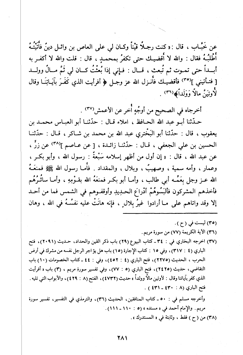 عَنْ خَبَّابٍ، قَالَ: «كُنْتُ رَجُلًا قَيْنًا وَكَانَ لِي عَلَى الْعَاصِ بْنِ وَائِلِ دَيْنٌ فَأَتَيْتُهُ أَطْلُبُهُ فَقَالَ: وَاللهِ لَا أَقْضِيكَ حَتَّى تَكْفُرَ بِمُحَمَّدٍ، قَالَ: قُلْتُ وَاللهِ لَا أَكْفُرُ بِهِ أَبَدًا حَتَّى تَمُوتَ ثُمَّ تُبْعَثَ، قَالَ: فَإِنِّي إِذَا بُعِثْتُ كَانَ لِي ثَمَّ مَالٌ وَوَلَدٌ [فَتَأْتِينِي] [ (35) ] فَأَقْضِيكَ فَأَنْزَلَ اللهُ عَزَّ وَجَلَّ أَفَرَأَيْتَ الَّذِي كَفَرَ بِآياتِنا وَقالَ لَأُوتَيَنَّ مَالًا وَوَلَداً [ (36) ] .