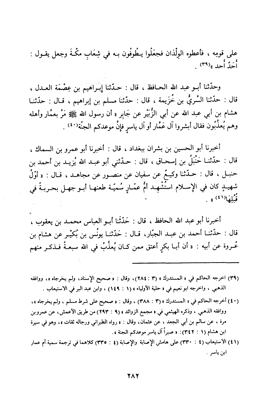 وحَدَّثَنَا أَبُو عَبْدِ اللهِ الْحَافِظُ، قَالَ: حَدَّثَنَا إِبْرَاهِيمُ بْنُ عِصْمَةَ الْعَدْلُ، قَالَ: حَدَّثَنَا السَّرِيُّ بْنُ خُزَيْمَةَ، قَالَ: حَدَّثَنَا مُسْلِمُ بْنُ إِبْرَاهِيمَ، قَالَ: حَدَّثَنَا هِشَامُ بْنُ أَبِي عَبْدِ اللهِ عَنْ أَبِي الزُّبَيْرِ عَنْ جَابِرِ «أَنَّ رَسُولَ اللهِ صَلَّى اللهُ عليه وآله وَسَلَّمَ مَرَّ بِعَمَّارِ وَأَهْلِهِ وَهُمْ يُعَذَّبُونَ فَقَالَ أَبْشِرُوا آلَ عَمَّارٍ أَوْ آلَ يَاسِرٍ فَإِنَّ مَوْعِدَكُمُ الْجَنَّةُ [ (40) ] .