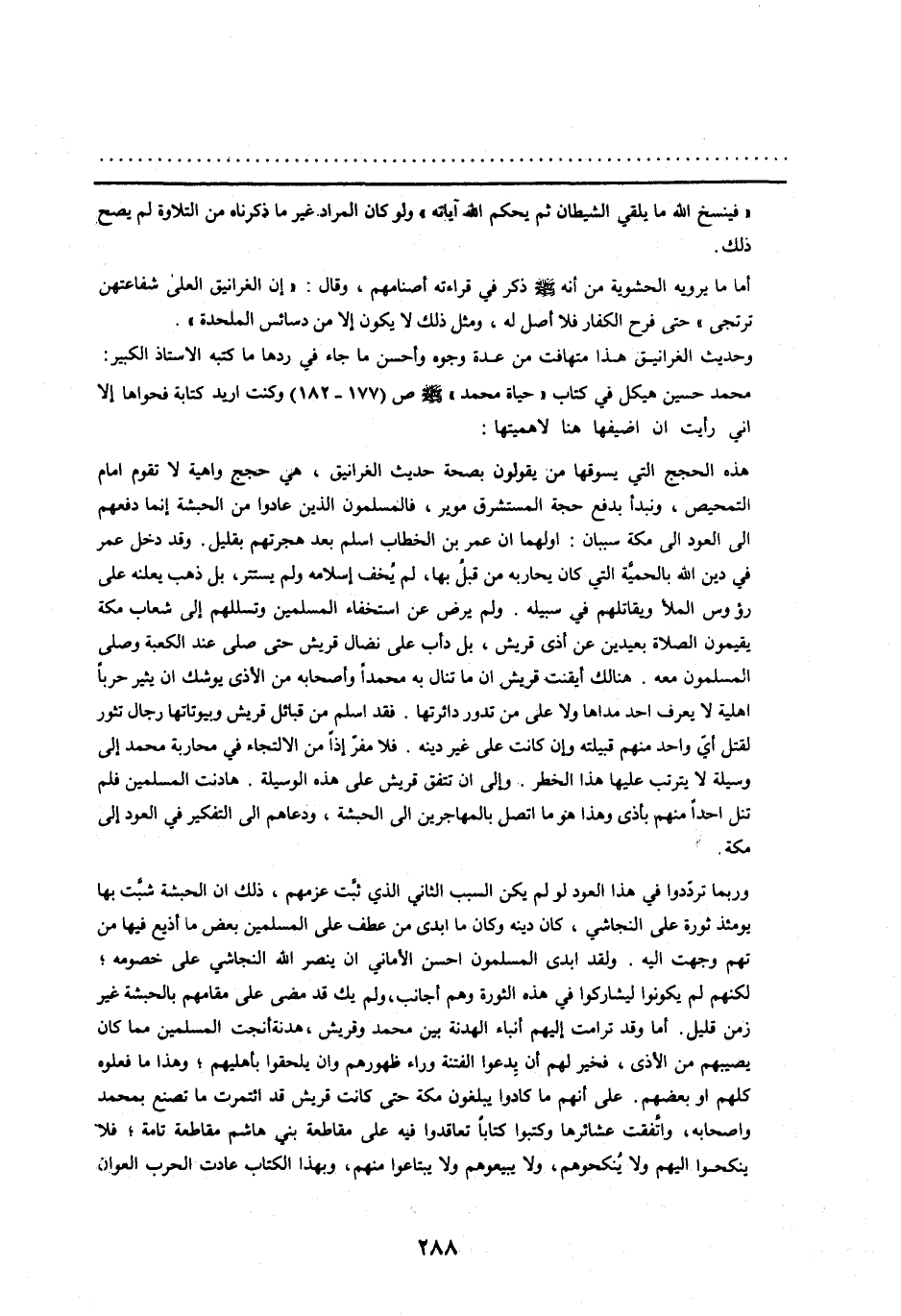 هذه الحجج التي يسوقها من يقولون بصحة حديث الغرانيق، هي حجج واهية لا تقوم امام التمحيص، ونبدأ بدفع حجة المستشرق موير، فالمسلمون الذين عادوا من الحبشة إنما دفعهم الى العود الى مكة سببان: أولهما ان عمر بن الخطاب اسلم بعد هجرتهم بقليل. وقد دخل عمر في دين الله بالحميّة التي كان يحاربه من قبل بها، لم يخف إسلامه ولم يستتر، بل ذهب يعلنه على رؤوس الملأ ويقاتلهم في سبيله. ولم يرض عن استخفاء المسلمين وتسللهم إلى شعاب مكة يقيمون الصلاة بعيدين عن أذى قريش، بل دأب على نضال قريش حتى صلى عند الكعبة وصلى المسلمون معه. هنالك أيقنت قريش ان ما تنال به محمدا وأصحابه من الأذى يوشك ان يثير حربا اهلية لا يعرف احد مداها ولا على من تدور دائرتها. فقد اسلم من قبائل قريش وبيوتاتها رجال تثور لقتل أيّ واحد منهم قبيلته وإن كانت على غير دينه. فلا مفرّ إذا من الالتجاء في محاربة محمد إلى وسيلة لا يترتب عليها هذا الخطر. وإلى ان تتفق قريش على هذه الوسيلة. هادنت المسلمين فلم تنل أحدا منهم بأذى وهذا هو ما اتصل بالمهاجرين الى الحبشة، ودعاهم الى التفكير في العود إلى مكة.