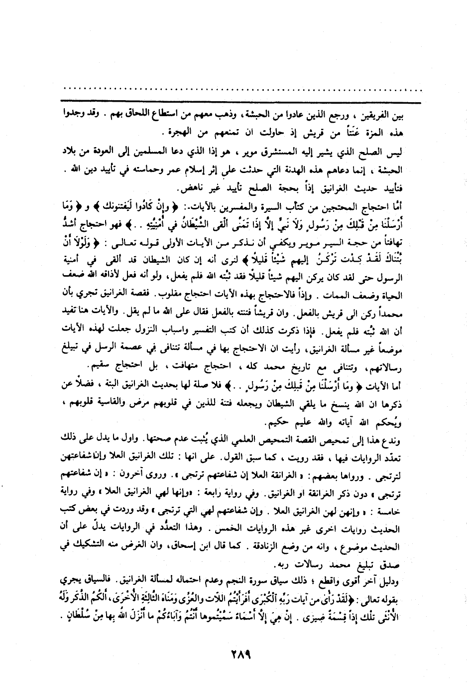 أمّا احتجاج المحتجين من كتاب السيرة والمفسرين بالآيات: وَإِنْ كادُوا لَيَفْتِنُونَكَ ووَ ما أَرْسَلْنا مِنْ قَبْلِكَ مِنْ رَسُولٍ وَلا نَبِيٍّ إِلَّا إِذا تَمَنَّى أَلْقَى الشَّيْطانُ فِي أُمْنِيَّتِهِ ... فهو احتجاج أشدّ تهافتا من حجة السير موير ويكفي أن نذكر من الآيات الأولى قوله تعالى: وَلَوْلا أَنْ ثَبَّتْناكَ لَقَدْ كِدْتَ تَرْكَنُ إِلَيْهِمْ شَيْئاً قَلِيلًا لنرى أنه إن كان الشيطان قد ألقى في أمنية الرسول حتى لقد كان يركن إليهم شيئا قليلا فقد ثبّته الله فلم يفعل، ولو أنه فعل لأذاقه الله ضعف الحياة وضعف الممات. وإذا فالاحتجاج بهذه الآيات احتجاج مقلوب. فقصة الغرانيق تجري بأن محمدا ركن الى قريش بالفعل. وان قريشا فتنته بالفعل فقال على الله ما لم يقل. والآيات هنا تفيد أن الله ثبّته فلم يفعل. فإذا ذكرت كذلك أن كتب التفسير واسباب النزول جعلت لهذه الآيات موضعا غير مسألة الغرانيق، رأيت ان الاحتجاج بها في مسألة تتنافى في عصمة الرسل في تبليغ رسالاتهم، وتتنافى مع تاريخ محمد كله، احتجاج متهافت، بل احتجاج سقيم.