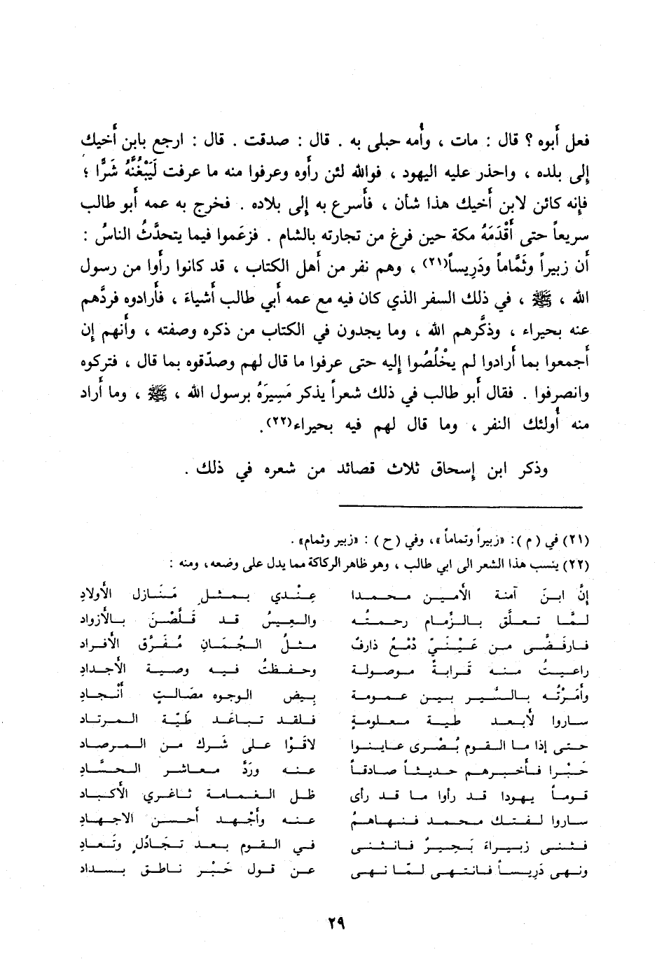 أَنَّ زُبَيْرًا وَثَمَّامًا وَدَرِيسًا [ (21) ] ، وَهُمْ نَفَرٌ مِنْ أَهْلِ الْكِتَابِ، قَدْ كَانُوا رَأَوْا مِنْ رَسُولِ اللهِ، صَلَّى الله عليه وآله وَسَلَّمَ، فِي ذَلِكَ السَّفَرِ الَّذِي كَانَ فِيهِ مَعَ عَمِّهِ أَبِي طَالِبٍ أَشْيَاءَ، فَأَرَادُوهُ فَرَدَّهُمْ عَنْهُ بَحِيرَاءُ، وَذَكَّرَهُمُ اللهَ، وَمَا يَجِدُونَ فِي الْكِتَابِ مِنْ ذِكْرِهِ وَصِفَتِهِ، وَأَنَّهُمْ إِنْ أَجْمَعُوا بِمَا أَرَادُوا لَمْ يَخْلُصُوا إِلَيْهِ حَتَّى عَرَفُوا مَا قَالَ لَهُمْ وَصَدَّقُوهُ بِمَا قَالَ، فَتَرَكُوهُ وَانْصَرَفُوا. فَقَالَ أَبُو طَالِبٍ فِي ذَلِكَ شِعْرًا يَذْكُرُ مَسِيرَهُ بِرَسُولِ اللهِ، صَلَّى اللهُ عليه وآله وَسَلَّمَ، وَمَا أَرَادَ مِنْهُ أُولَئِكَ النَّفَرُ، وَمَا قَالَ لَهُمْ فِيهِ بَحِيرَاءُ [ (22) ] .