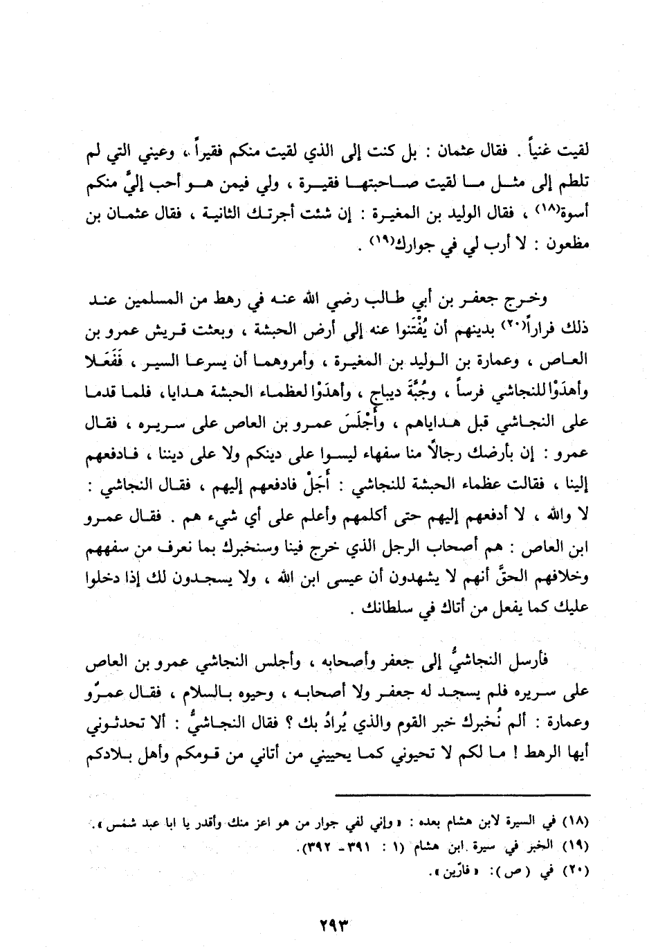 وَخَرَجَ جَعْفَرِ بْنِ أَبِي طَالِبٍ رَضِيَ اللهُ عَنْهُ فِي رَهْطٍ مِنَ الْمُسْلِمِينَ عِنْدَ ذَلِكَ فِرَارًا [ (20) ] بِدِينِهِمْ أَنْ يُفْتَنُوا عَنْهُ إِلَى أَرْضِ الْحَبَشَةِ، وَبَعَثَتْ قُرَيْشٌ عَمْرَو بْنَ الْعَاصِ، وَعُمَارَةَ بْنَ الْوَلِيدِ بْنِ الْمُغِيرَةِ، وَأَمَرُوهُمَا أَنْ يُسْرِعَا السَّيْرَ، فَفَعَلَا وَأَهْدَوْا لِلنَّجَاشِيِّ فَرَسًا، وَجُبَّةَ دِيبَاجٍ، وَأَهْدَوْا لِعُظَمَاءِ الْحَبَشَةِ هَدَايَا، فَلَمَّا قَدِمَا عَلَى النَّجَاشِيِّ قَبِلَ هَدَايَاهُمْ، وَأَجْلَسَ عَمْرَو بْنَ الْعَاصِ عَلَى سَرِيرِهِ، فَقَالَ عَمْرٌو: إِنَّ بِأَرْضِكَ رِجَالًا مِنَّا سُفَهَاءَ لَيْسُوا عَلَى دِينِكُمْ وَلَا عَلَى دِينِنَا، فَادْفَعْهُمْ إِلَيْنَا، فَقَالَتْ عُظَمَاءُ الْحَبَشَةِ لِلنَّجَاشِيِّ: أَجَلْ فَادْفَعْهُمْ إِلَيْهِمْ، فَقَالَ النَّجَاشِيُّ: