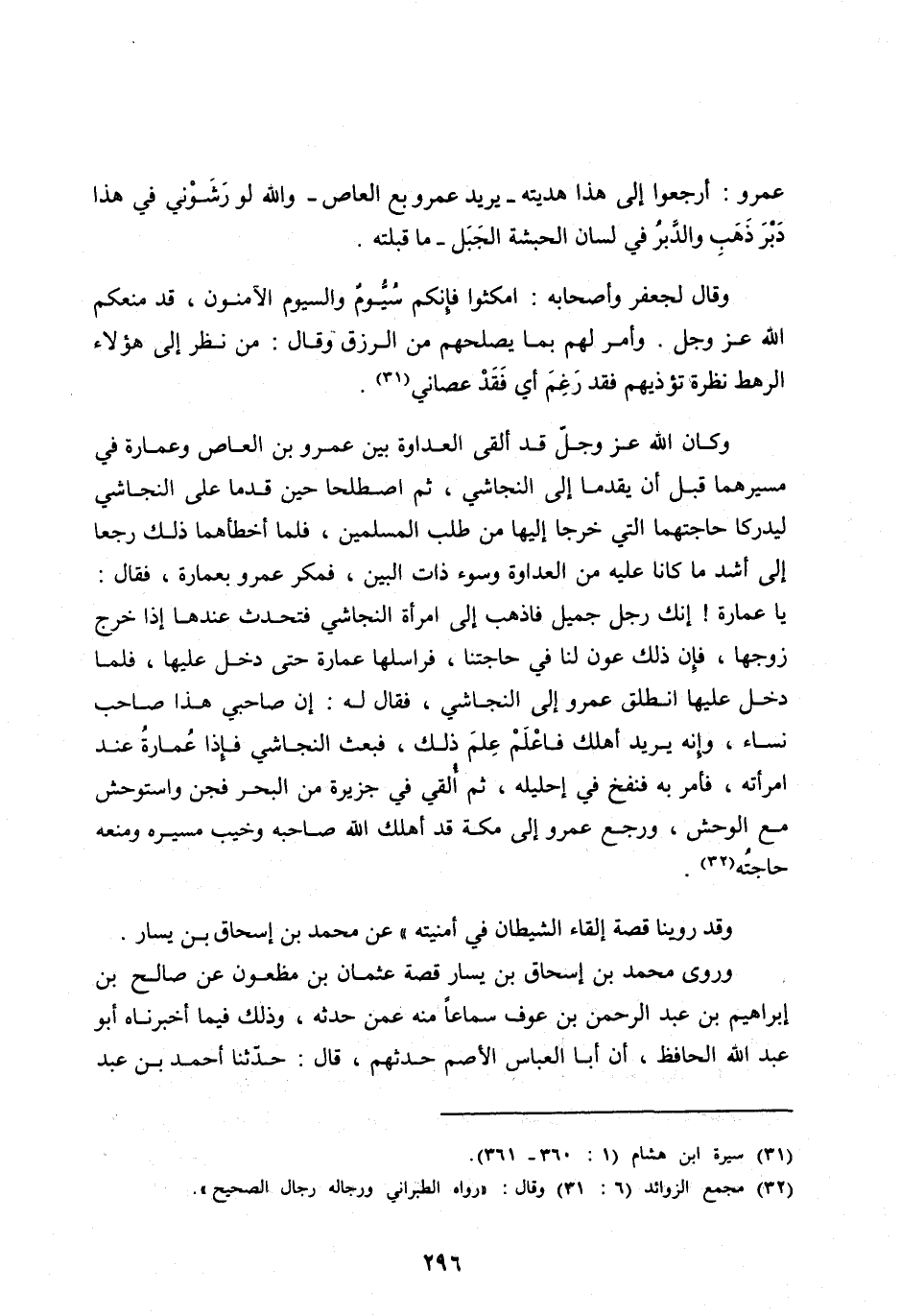 يَا عُمَارَةُ! إِنَّكَ رَجُلٌ جَمِيلٌ فَاذْهَبْ إِلَى امْرَأَةِ النَّجَاشِيِّ فَتَحَدَّثْ عِنْدَهَا إِذَا خَرَجَ زَوْجُهَا، فَإِنَّ ذَلِكَ عَوْنٌ لَنَا فِي حَاجَتِنَا، فَرَاسَلَهَا عُمَارَةُ حَتَّى دَخَلَ عَلَيْهَا، فَلَمَّا دَخَلَ عَلَيْهَا انْطَلَقَ عَمْرٌو إِلَى النَّجَاشِيِّ، فَقَالَ لَهُ: إِنَّ صَاحِبِي هَذَا صَاحِبُ نِسَاءٍ، وَإِنَّهُ يُرِيدُ أَهْلَكَ فَاعْلَمْ عِلْمَ ذَلِكَ، فَبَعَثَ النَّجَاشِيُّ فَإِذَا عُمَارَةُ عِنْدَ امْرَأَتِهِ، فَأَمَرَ بِهِ فَنُفِخَ فِي إِحْلِيلِهِ، ثُمَّ أُلْقِيَ فِي جَزِيرَةٍ مِنَ الْبَحْرِ فَجُنَّ وَاسْتَوحَشَ مَعَ الْوَحْشِ، وَرَجَعَ عَمْرٌو إِلَى مَكَّةَ قَدْ أَهْلَكَ اللهُ صَاحِبَهُ وَخَيَّبَ مَسِيرَهُ وَمَنْعَهُ حَاجَتَهُ [ (32) ] .