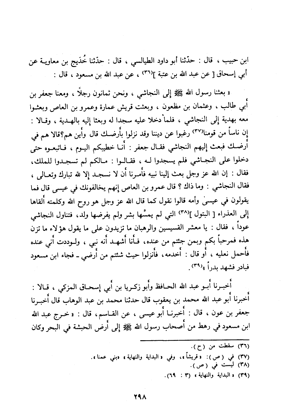 إِنَّ نَاسًا مِنْ قَوْمِنَا [ (37) ] رَغِبُوا عَنْ دِينِنَا وَقَدْ نَزَلُوا بِأَرْضِكَ قَالَ وَأَيْنَ هُمْ؟ قَالَا هُمْ فِي أَرْضِكَ فَبَعَثَ إِلَيْهِمُ النَّجَاشِيُّ فَقَالَ جَعْفَرٌ: أَنَا خَطِيبُكُمُ الْيَوْمَ، فَاتَّبَعُوهُ حَتَّى دَخَلُوا عَلَى النَّجَاشِيِّ فَلَمْ يَسْجُدُوا لَهُ، فَقَالُوا: مَا لَكُمْ لَمْ تَسْجُدُوا لِلْمَلِكِ، فَقَالَ: إِنَّ اللهَ عَزَّ وَجَلَّ بَعَثَ إِلَيْنَا نَبِيَّهُ فَأَمَرَنَا أَنْ لَا نَسْجُدَ إِلَّا لِلَّهِ تَبَارَكَ وَتَعَالَى، فَقَالَ النَّجَاشِيُّ: وَمَا ذَاكَ؟ قَالَ عَمْرُو بْنُ الْعَاصِ إِنَّهُمْ يُخَالِفُونَكَ فِي عِيسَى قَالَ فَمَا يَقُولُونَ فِي عِيسَى وَأُمِّهِ قَالُوا نَقُولُ كَمَا قَالَ اللهُ عَزَّ وَجَلَّ هُوَ رُوحُ اللهِ وَكَلِمَتُهُ أَلْقَاهَا إِلَى الْعَذْرَاءِ [الْبَتُولِ] [ (38) ] الَّتِي لَمْ يَمَسَّهَا بَشَرٌ وَلَمْ يَفْرِضْهَا وَلَدٌ، فَتَنَاوَلَ النَّجَاشِيُّ عُودًا، فَقَالَ: يَا مَعْشَرَ الْقِسِّيسِينَ وَالرُّهْبَانَ مَا تَزِيدُونَ عَلَى مَا يَقُولُ هَؤُلَاءِ مَا تَزِنُ هَذِهِ فَمَرْحَبًا بِكُمْ وَبِمَنْ جِئْتُمْ مِنْ عِنْدِهِ، فَأَنَا أَشْهَدُ أَنَّهُ نَبِيٌّ، وَلَوَدِدْتُ أَنِّي عِنْدَهُ فَأَحْمِلُ نَعْلَيْهِ، أَوْ قَالَ: أَخْدُمُهُ، فَانْزِلُوا حَيْثُ شِئْتُمْ مِنْ أَرْضِي- فَجَاءَ ابْنُ مَسْعُودٍ فَبَادَرَ فَشَهِدَ بَدْرًا» [ (39) ] .