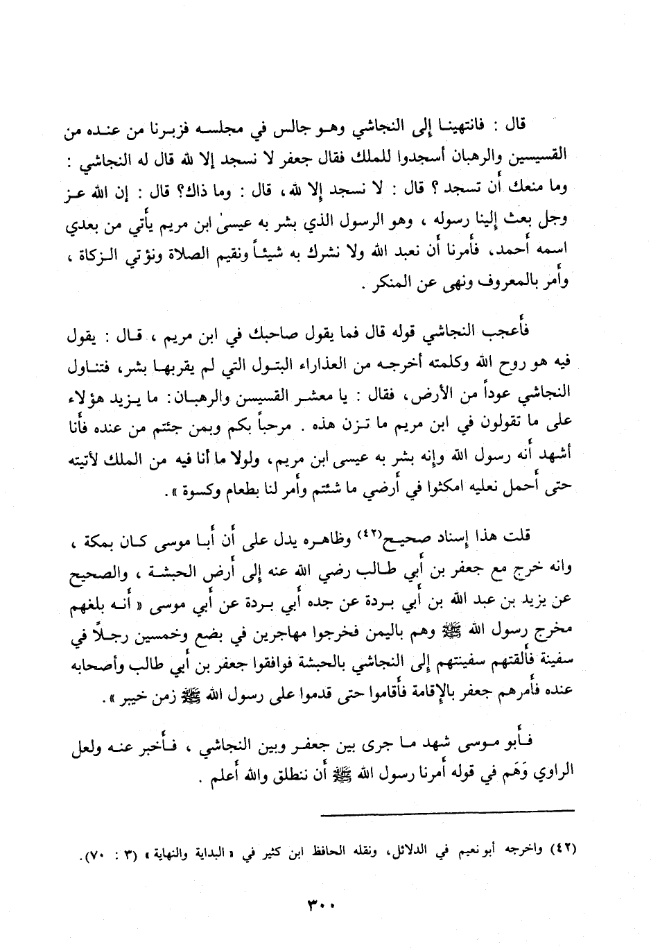 فَأَعْجَبَ النَّجَاشِيَّ قَوْلُهُ قَالَ فَمَا يَقُولُ صَاحِبُكَ فِي ابْنِ مَرْيَمَ، قَالَ: يَقُولُ فِيهِ هُوَ رُوحُ اللهِ وَكَلِمَتُهُ أَخْرَجَهُ مِنَ الْعَذْرَاءِ الْبَتُولِ الَّتِي لَمْ يَقْرَبْهَا بَشَرٌ، فَتَنَاوَلَ النَّجَاشِيُّ عُودًا مِنَ الْأَرْضِ، فَقَالَ: يَا مَعْشَرَ الْقِسِّيسِينَ وَالرُّهْبَانِ: مَا يَزِيدُ هَؤُلَاءِ عَلَى مَا تَقُولُونَ فِي ابْنِ مَرْيَمَ مَا تَزِنُ هَذِهِ. مَرْحَبًا بِكُمْ وَبِمَنْ جِئْتُمْ مِنْ عِنْدِهِ فَأَنَا أَشْهَدُ أَنَّهُ رَسُولُ اللهِ وَإِنَّهُ بَشَّرَ بِهِ عيسى بن مَرْيَمَ، وَلَوْلَا مَا أَنَا فِيهِ مِنَ الْمُلْكِ لَأَتَيْتُهُ حَتَّى أَحْمِلَ نَعْلَيْهِ امْكُثُوا فِي أَرْضِي مَا شِئْتُمْ وَأَمَرَ لَنَا بِطَعَامٍ وَكِسْوَةٍ» .