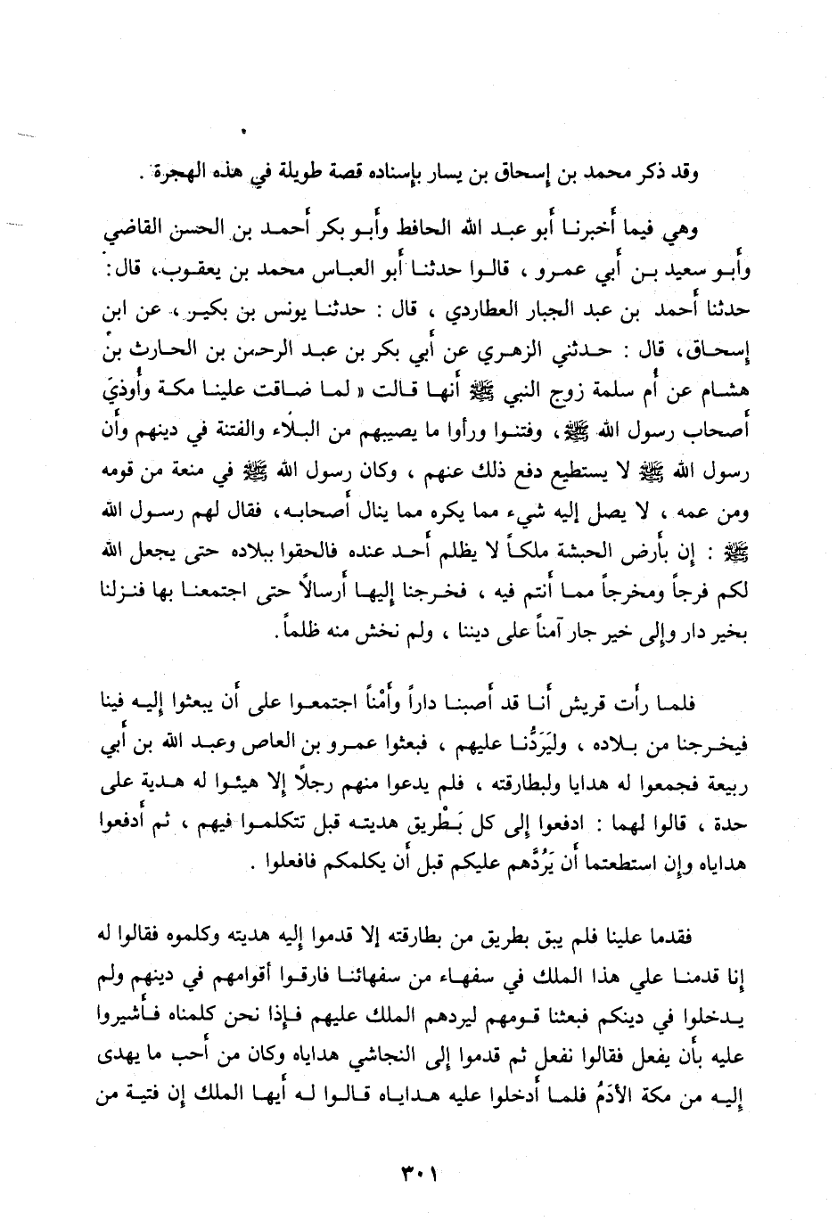حَدَّثَنَا أَحْمَدُ بْنُ عَبْدِ الْجَبَّارِ الْعُطَارِدِيُّ، قَالَ: حَدَّثَنَا يُونُسُ بْنُ بُكَيْرٍ، عَنِ ابْنِ إِسْحَاقَ، قَالَ: حَدَّثَنِي الزُّهْرِيُّ عَنْ أَبِي بَكْرِ بْنِ عَبْدِ الرَّحْمَنِ بْنِ الْحَارِثِ بْنِ هِشَامٍ عَنْ أُمِّ سَلَمَةَ زَوْجِ النَّبِيِّ صَلَّى الله عليه وآله وَسَلَّمَ أَنَّهَا قَالَتْ «لَمَّا ضَاقَتْ عَلَيْنَا مَكَّةُ وَأُوذِيَ أصحاب رسول الله صلى الله عليه وآله وَسَلَّمَ، وَفُتِنُوا وَرَأَوْا مَا يُصِيبُهُمْ مِنَ الْبَلَاءِ وَالْفِتْنَةِ فِي دِينِهِمْ وَأَنَّ رَسُولَ اللهِ صَلَّى الله عليه وآله وَسَلَّمَ لَا يَسْتَطِيعُ دَفْعَ ذَلِكَ عَنْهُمْ، وَكَانَ رَسُولُ اللهِ صَلَّى الله عليه وآله وَسَلَّمَ فِي مَنَعَةٍ مِنْ قَوْمِهِ وَمِنْ عَمِّهِ، لَا يَصِلُ إِلَيْهِ شَيْءٌ مِمَّا يَكْرَهُ مِمَّا يَنَالُ أَصْحَابُهُ، فَقَالَ لَهُمْ رَسُولُ اللهِ صَلَّى اللهُ عَلَيْهِ وآله وَسَلَّمَ: إِنَّ بِأَرْضِ الْحَبَشَةِ مَلِكًا لَا يُظْلَمُ أَحَدٌ عِنْدَهُ فَالْحَقُوا بِبِلَادِهِ حَتَّى يَجْعَلَ اللهُ لَكُمْ فَرَجًا وَمَخْرَجًا مِمَّا أَنْتُمْ فِيهِ، فَخَرَجْنَا إِلَيْهَا أَرْسَالًا حَتَّى اجْتَمَعْنَا بِهَا فَنَزَلْنَا بِخَيْرِ دَارٍ وَإِلَى خَيْرِ جَارٍ آمَنَّا عَلَى دِينِنَا، وَلَمْ نَخْشَ مِنْهُ ظُلْمًا.