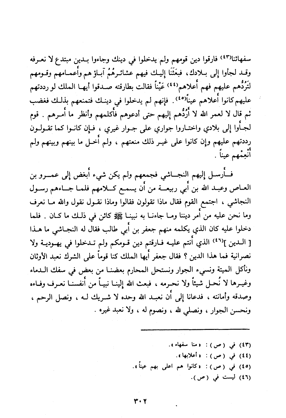 فَأَرْسَلَ إِلَيْهِمُ النَّجَاشِيُّ فَجَمَعَهُمْ وَلَمْ يَكُنْ شَيْءٌ أَبْغَضَ إِلَى عمرو بن العاص وَعَبْدُ اللهِ بْنِ أَبِي رَبِيعَةَ مِنْ أَنْ يَسْمَعَ كَلَامَهُمْ فَلَمَّا جَاءَهُمْ رَسُولُ النَّجَاشِيِّ، اجْتَمَعَ الْقَوْمُ فَقَالَ مَاذَا تَقُولُونَ فَقَالُوا وَمَاذَا نَقُولُ نَقُولُ وَاللهِ مَا نَعْرِفُ وَمَا نَحْنُ عَلَيْهِ مِنْ أَمْرِ دِينِنَا وَمَا جَاءَنَا بِهِ نَبِيُّنَا صَلَّى اللهُ عليه وآله وَسَلَّمَ كَائِنٌ فِي ذَلِكَ مَا كَانَ. فَلَمَّا دَخَلُوا عَلَيْهِ كَانَ الَّذِي يكَلِّمُهُ مِنْهُمْ جَعْفَرُ بْنُ أَبِي طَالِبٍ فَقَالَ لَهُ النَّجَاشِيُّ مَا هَذَا [الدِّينُ] [ (46) ] الَّذِي أَنْتُمْ عَلَيْهِ فَارَقْتُمْ دِينَ قَوْمِكُمْ وَلَمْ تَدْخُلُوا فِي يَهُودِيَّةٍ وَلَا نَصْرَانِيَّةٍ فَمَا هَذَا الدِّينُ؟ فَقَالَ جَعْفَرٌ أَيُّهَا الْمَلِكُ كُنَّا قَوْمًا عَلَى الشِّرْكِ نَعْبُدُ الْأَوْثَانَ وَنَأْكُلُ الْمَيْتَةُ وَنُسِيءُ الْجِوَارَ وَنَسْتَحِلُّ الْمَحَارِمَ بَعْضُنَا مِنْ بَعْضٍ فِي سَفْكِ الدِّمَاءِ وَغَيْرِهَا لَا نُحِلُّ شَيْئًا وَلَا نُحَرِّمُهُ، فَبَعَثَ اللهُ إِلَيْنَا نَبِيًّا مِنْ أَنْفُسِنَا نَعْرِفُ وَفَاءَهُ وَصِدْقَهُ وَأَمَانَتَهُ، فَدَعَانَا إِلَى أَنْ نَعْبُدَ اللهَ وَحْدَهُ لَا شَرِيكَ لَهُ، وَنَصِلَ الرَّحِمَ، وَنُحْسِنَ الْجِوَارَ، وَنُصَلِّيَ لِلَّهِ، وَنَصُومَ لَهُ، وَلَا نَعْبُدَ غَيْرَهُ.