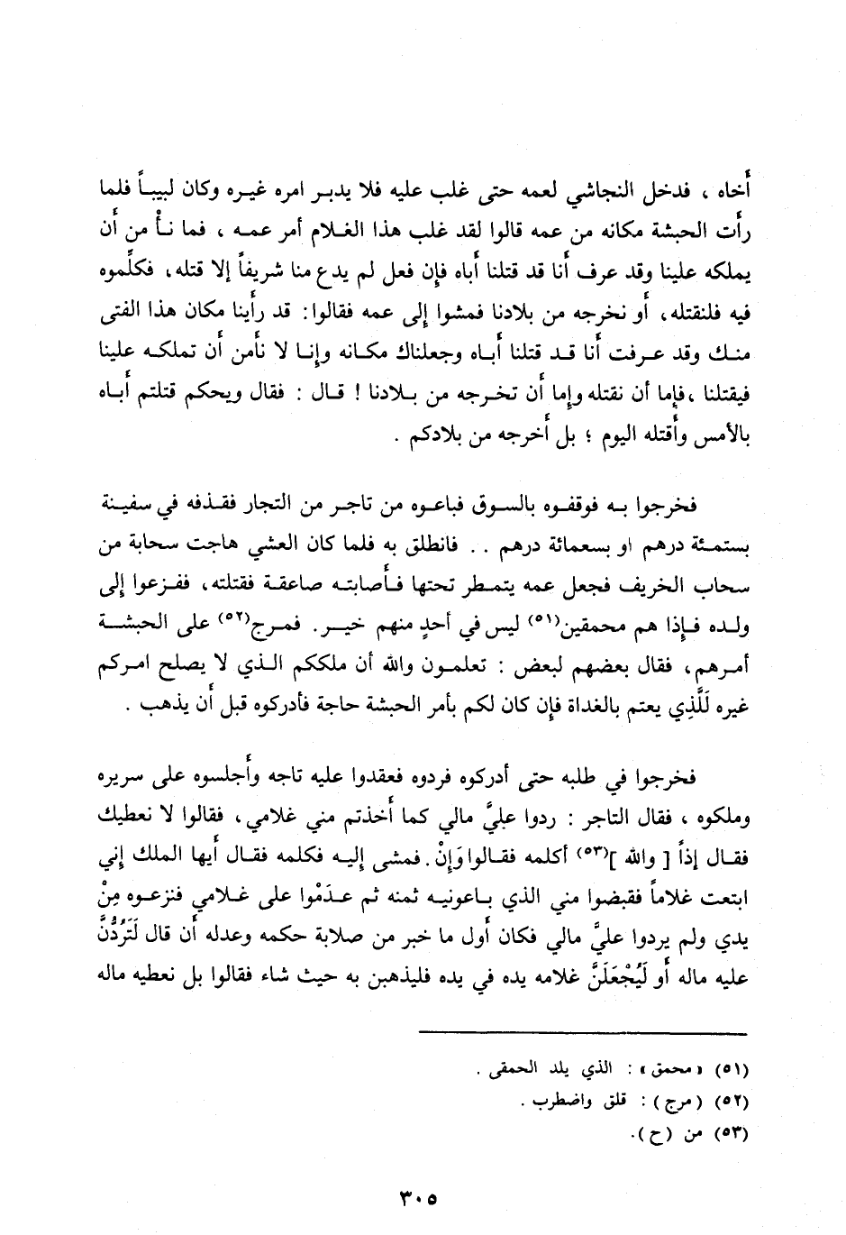 فَخَرَجُوا بِهِ فَوَقَفُوهُ بِالسُّوقِ فَبَاعُوهُ مِنْ تَاجِرٍ مِنَ التُّجَّارِ فَقَذَفَهُ فِي سفينة بستمئة دِرْهَمٍ أَوْ بِسَبْعِمِائَةِ دِرْهَمٍ.. فَانْطَلَقَ بِهِ فَلَمَّا كَانَ الْعَشِيُّ هَاجَتْ سَحَابَةٌ مِنْ سَحَابِ الْخَرِيفِ فَجَعَلَ عَمُّهُ يَتَمَطَّرُ تَحْتَهَا فَأَصَابَتْهُ صَاعِقَةٌ فَقَتَلَتْهُ، فَفَزِعُوا إِلَى وَلَدِهِ فَإِذَا هُمْ مُحَمَّقِينَ [ (51) ] لَيْسَ فِي أَحَدٍ مِنْهُمْ خَيْرٌ. فَمَرَجَ [ (52) ] عَلَى الْحَبَشَةِ أَمْرُهُمْ، فَقَالَ بَعْضُهُمْ لِبَعْضٍ: تَعْلَمُونَ وَاللهِ إِنَّ مَلِكَكُمُ الَّذِي لَا يُصْلِحُ أَمْرَكُمْ غَيْرُهُ للّذي يعتم بِالْغَدَاةِ فَإِنْ كَانَ لَكُمْ بِأَمْرِ الْحَبَشَةِ حَاجَةٌ فَأَدْرِكُوهُ قَبْلَ أَنْ يَذْهَبَ.