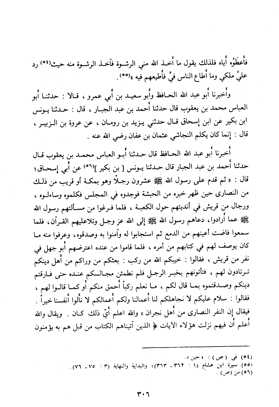 أَخْبَرَنَا أَبُو عَبْدِ اللهِ الْحَافِظُ قَالَ حَدَّثَنَا أَبُو الْعَبَّاسِ مُحَمَّدُ بْنُ يَعْقُوبَ قَالَ حَدَّثَنَا أَحْمَدُ بْنُ عَبْدِ الْجَبَّارِ قَالَ حَدَّثَنَا يُونُسُ [بْنُ بُكَيْرٍ] [ (56) ] عَنْ أَبِي إِسْحَاقَ، قَالَ: «ثُمَّ قَدِمَ عَلَى رَسُولِ اللهِ صَلَّى اللهُ عليه وآله وَسَلَّمَ عِشْرُونَ رَجُلًا وَهُوَ بِمَكَّةَ أَوْ قَرِيبٍ مِنْ ذَلِكَ مِنَ النَّصَارَى حِينَ ظَهَرَ خَبَرُهُ مِنَ الْحَبَشَةِ فَوَجَدُوهُ فِي الْمَجْلِسِ فَكَلَّمُوهُ وَسَاءَلُوهُ، وَرِجَالٌ مِنْ قُرَيْشٍ فِي أَنْدِيَتِهِمْ حَوْلَ الْكَعْبَةِ، فَلَمَّا فَرَغُوا مِنْ مَسْأَلَتِهِمْ رَسُولَ اللهِ صَلَّى اللهُ عليه وآله وَسَلَّمَ عَمَّا أَرَادُوا، دَعَاهُمْ رَسُولُ اللهِ صَلَّى اللهُ عليه وآله وَسَلَّمَ إِلَى اللهِ عَزَّ وَجَلَّ وَتَلَا عَلَيْهِمُ الْقُرْآنَ، فَلَمَّا سَمِعُوا فَاضَتْ أَعْيُنُهُمْ مِنَ الدَّمْعِ ثُمَّ اسْتَجَابُوا لَهُ وَآمَنُوا بِهِ وَصَدَّقُوهُ، وَعَرَفُوا مِنْهُ مَا كَانَ يُوصَفُ لَهُمْ فِي كِتَابِهِمْ مِنْ أَمْرِهِ، فَلَمَّا قَامُوا مِنْ عِنْدِهِ اعْتَرَضَهُمْ أَبُو جَهْلٍ فِي نَفَرٍ مِنْ قُرَيْشٍ، فَقَالُوا: خَيَّبَكُمُ اللهُ مِنْ رَكْبٍ: بَعَثَكُمْ مَنْ وراكم مِنْ أَهْلِ دِينِكُمْ تَرْتَادُونَ لَهُمْ، فَتَأْتُونَهُمْ بِخَبَرِ الرَّجُلِ فَلَمْ نَطْمَئِنْ مَجَالِسَكُمْ عِنْدَهُ حَتَّى فَارَقْتُمْ دِينَكُمْ وَصَدَّقْتُمُوهُ بِمَا قَالَ لَكُمْ، مَا نَعْلَمُ رَكْبًا أَحْمَقَ مِنْكُمْ أَوْ كَمَا قَالُوا لَهُمْ، فَقَالُوا: سَلَامٌ عَلَيْكُمْ لَا نُجَاهِلُكُمْ لَنَا أَعْمَالُنَا وَلَكُمْ أَعْمَالُكُمْ لَا نَأْلُوا أَنْفُسَنَا خَيْرًا.