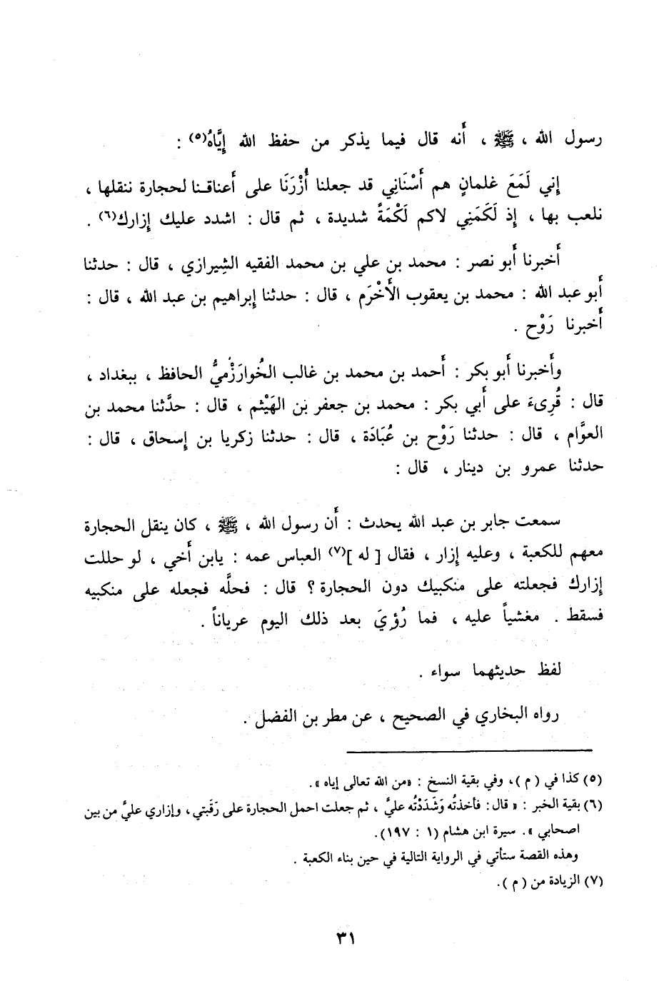 سَمِعْتُ جَابِرَ بْنَ عَبْدِ اللهِ يُحَدِّثُ: أَنَّ رَسُولَ اللهِ، صلى الله عليه وآله وَسَلَّمَ، كَانَ يَنْقُلُ الْحِجَارَةَ مَعَهُمْ لِلْكَعْبَةِ، وَعَلَيْهِ إِزَارٌ، فَقَالَ [لَهُ] [ (7) ] الْعَبَّاسُ عَمُّهُ: يَا ابْنَ أَخِي، لَوْ حَلَلْتَ إِزَارَكَ فَجَعَلْتَهُ عَلَى مَنْكِبَيْكَ دُونَ الْحِجَارَةِ؟ قَالَ: فَحَلَّهُ فَجَعَلَهُ عَلَى مَنْكِبَيْهِ فَسَقَطَ. مَغْشِيًّا عَلَيْهِ، فَمَا رؤي بَعْدَ ذَلِكَ الْيَوْمِ عُرْيَانًا.