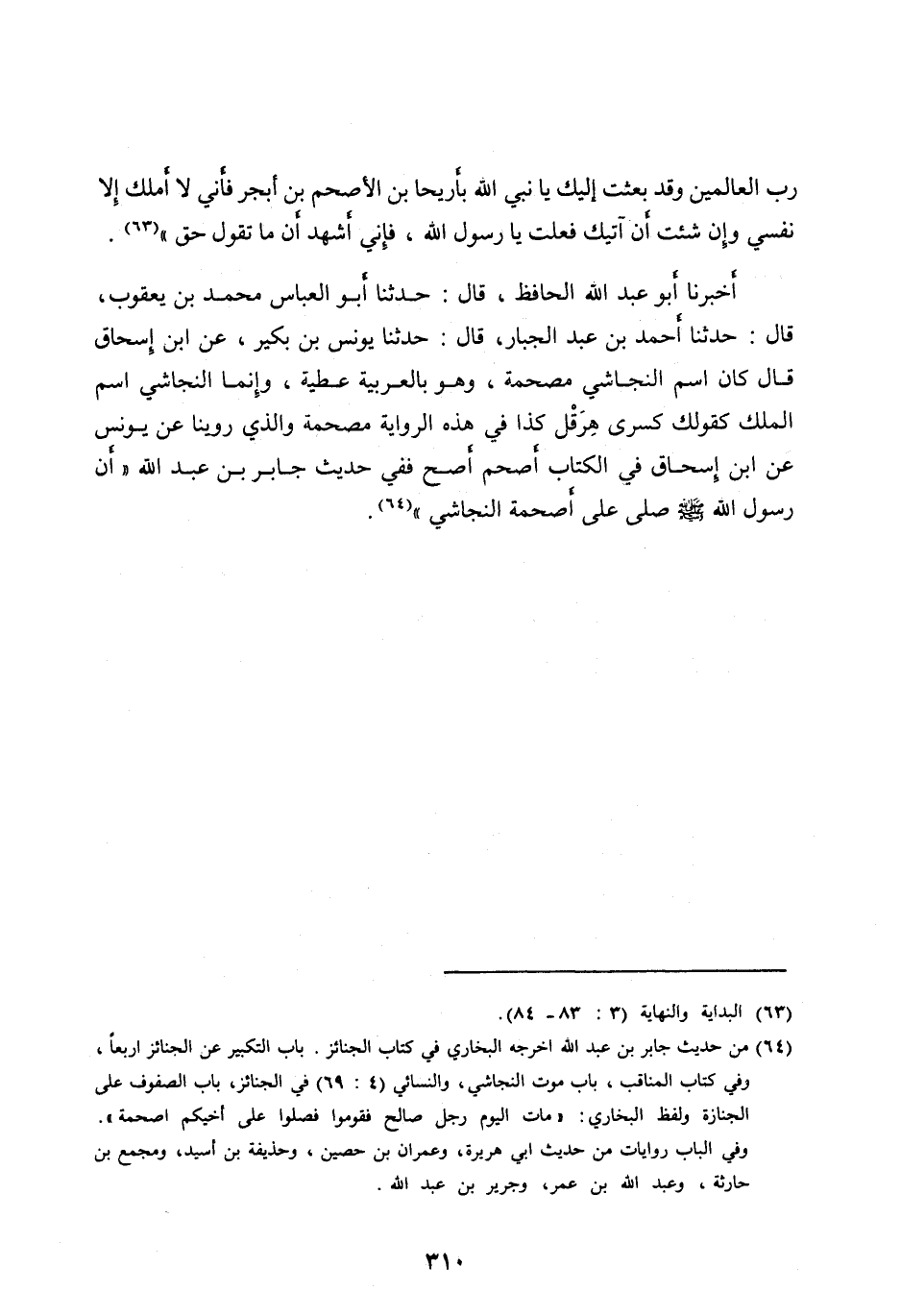 أَخْبَرَنَا أَبُو عَبْدِ اللهِ الْحَافِظُ، قَالَ: حَدَّثَنَا أَبُو الْعَبَّاسِ مُحَمَّدُ بْنُ يَعْقُوبَ، قَالَ: حَدَّثَنَا أَحْمَدُ بْنُ عَبْدِ الْجَبَّارِ، قَالَ: حَدَّثَنَا يُونُسُ بْنُ بُكَيْرٍ، عَنِ ابْنِ إِسْحَاقَ قَالَ كَانَ اسْمُ النَّجَاشِيِّ مَصْحَمَةَ، وَهُوَ بِالْعَرَبِيَّةِ عَطِيَّةُ، وَإِنَّمَا النَّجَاشِيُّ اسْمُ الْمَلِكِ كَقَوْلِكَ كِسْرَى هِرَقْلَ كَذَا فِي هَذِهِ الرِّوَايَةَ مَصْحَمَةُ وَالَّذِي رُوِّينَا عَنْ يُونُسَ عَنِ ابْنِ إِسْحَاقَ فِي الْكِتَابِ أَصْحَمُ أَصَحُّ فَفِي حَدِيثِ جَابِرِ بْنِ عَبْدِ اللهِ «أَنَّ رَسُولَ اللهِ صَلَّى اللهُ عليه وآله وَسَلَّمَ صَلَّى عَلَى أَصْحَمَةَ النجاشي» [ (64) ] .
