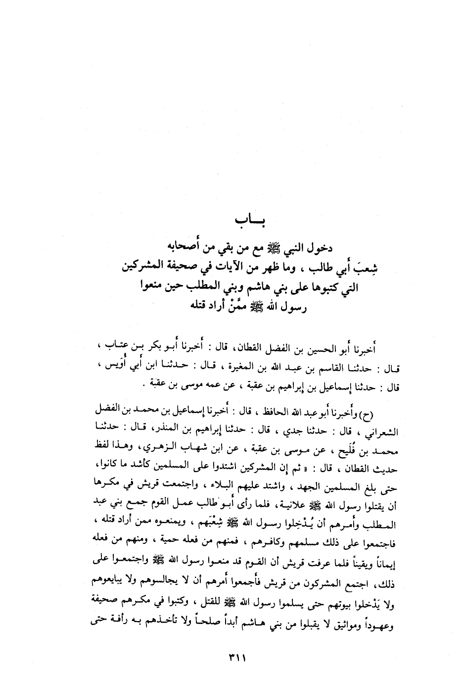 (ح) وَأَخْبَرَنَا أَبُو عَبْدِ اللهِ الْحَافِظُ، قَالَ: أَخْبَرَنَا إِسْمَاعِيلُ بْنُ مُحَمَّدِ بْنِ الْفَضْلِ الشَّعْرَانِيُّ، قَالَ: حَدَّثَنَا جَدِّي، قَالَ: حَدَّثَنَا إِبْرَاهِيمُ بْنُ الْمُنْذِرِ، قَالَ: حَدَّثَنَا مُحَمَّدُ بْنُ فُلَيْحٍ، عَنْ مُوسَى بْنِ عُقْبَةَ، عَنِ ابْنِ شِهَابٍ الزُّهْرِيِّ، وَهَذَا لَفْظُ حَدِيثِ الْقَطَّانِ، قَالَ: «ثُمَّ إِنَّ الْمُشْرِكِينَ اشْتَدُّوا عَلَى الْمُسْلِمِينَ كَأَشَدِّ مَا كَانُوا، حَتَّى بَلَغَ الْمُسْلِمِينَ الْجَهْدُ، وَاشْتَدَّ عَلَيْهِمُ الْبَلَاءُ، وَاجْتَمَعَتْ قُرَيْشٌ فِي مَكْرِهَا أَنْ يَقْتُلُوا رَسُولَ اللهِ صلى الله عليه وآله وَسَلَّمَ عَلَانِيَةً، فَلَمَّا رَأَى أَبُو طَالِبٍ عَمَلَ الْقَوْمِ جَمَعَ بَنِي عَبْدِ الْمُطَّلِبِ وَأَمَرَهُمْ أَنْ يُدْخِلُوا رَسُولَ اللهِ صَلَّى اللهُ عَلَيْهِ وآله وَسَلَّمَ شِعْبَهُمْ، وَيَمْنَعُوهُ مِمَّنْ أَرَادَ قَتْلَهُ، فَاجْتَمَعُوا عَلَى ذَلِكَ مُسْلِمُهُمْ وَكَافِرُهُمْ، فَمِنْهُمْ مَنْ فَعَلَهُ حَمِيَّةً، وَمِنْهُمْ مَنْ فَعَلَهُ إِيمَانًا وَيَقِينًا فَلَمَّا عَرَفَتْ قُرَيْشٌ أَنَّ الْقَوْمَ قَدْ مَنَعُوا رَسُولَ الله صلى الله عليه وآله وَسَلَّمَ وَاجْتَمَعُوا عَلَى ذَلِكَ، اجْتَمَعَ الْمُشْرِكُونَ مِنْ قُرَيْشٍ فَأَجْمِعُوا أَمْرَهُمْ أَنْ لَا يُجَالِسُوهُمْ وَلَا يُبَايِعُوهُمْ وَلَا يَدْخُلُوا بُيُوتَهُمْ حَتَّى يُسْلِمُوا رَسُولَ اللهِ صَلَّى الله عليه وآله وَسَلَّمَ لِلْقَتْلِ، وَكَتَبُوا فِي مَكْرِهِمْ صَحِيفَةً وَعُهُودًا وَمَوَاثِيقَ لَا يَقْبَلُوا مِنْ بَنِي هَاشِمٍ أَبَدًا صُلْحًا وَلَا تَأْخُذُهُمْ بِهِ رَأْفَةٌ حَتَّى