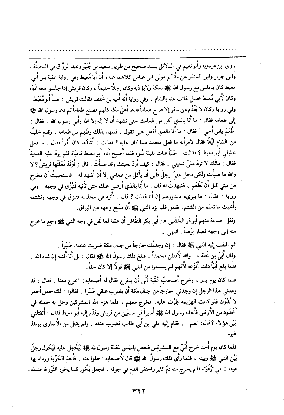 وقال أبيّ بن خلف: والله لأقتلن محمدا. فبلغ ذلك رسول الله صلّى الله عليه وآله وسلّم فقال: بل أنا أقتله إن شاء الله.