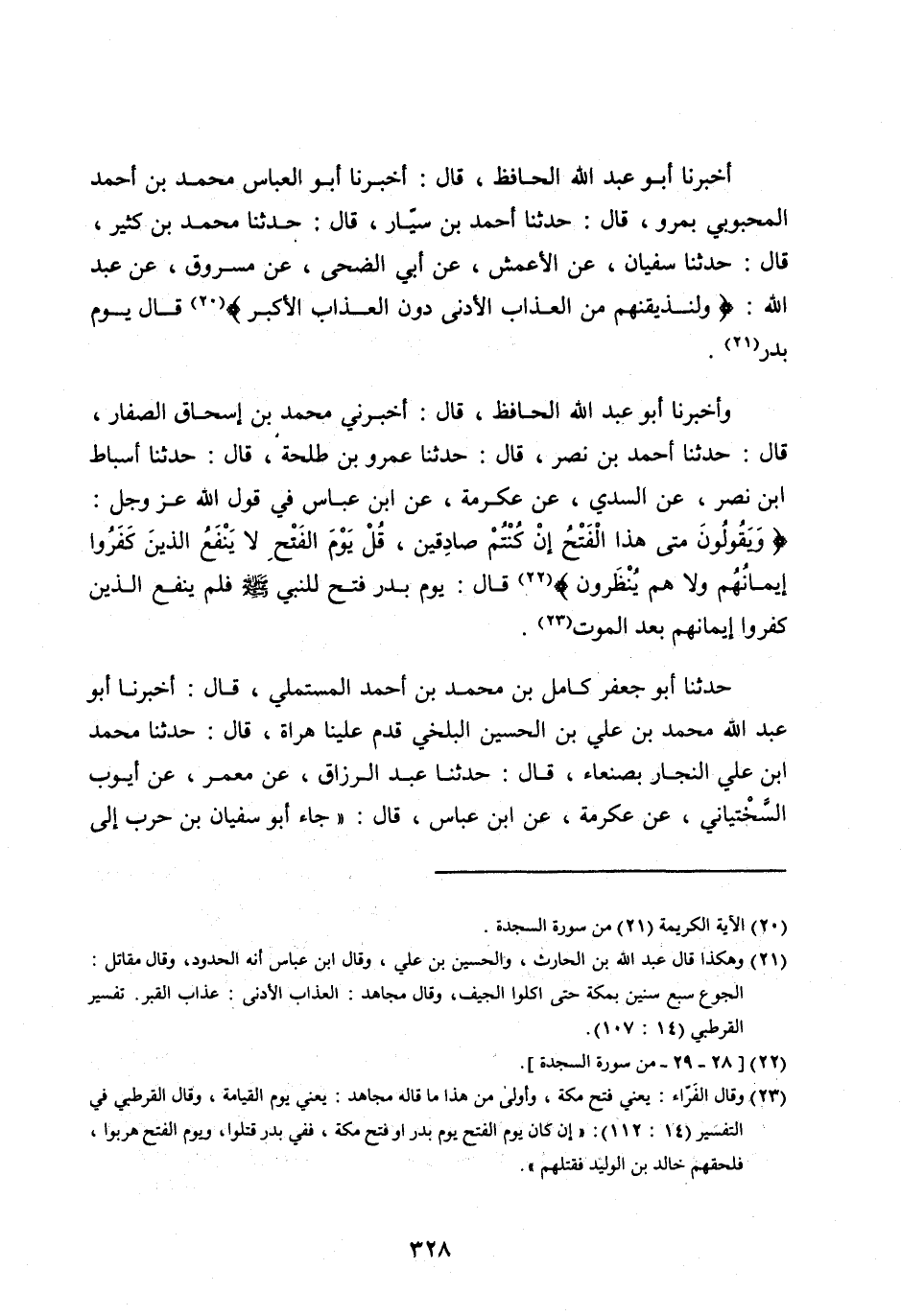 أَخْبَرَنَا أَبُو عَبْدِ اللهِ الْحَافِظُ، قَالَ: أَخْبَرَنَا أَبُو الْعَبَّاسِ مُحَمَّدُ بْنُ أَحْمَدَ الْمَحْبُوبِيُّ بِمَرْوَ، قَالَ: حَدَّثَنَا أَحْمَدُ بْنُ سَيَّارٍ، قَالَ: حَدَّثَنَا مُحَمَّدُ بْنُ كَثِيرٍ، قَالَ: حَدَّثَنَا سُفْيَانُ، عَنِ الْأَعْمَشِ، عَنْ أَبِي الضُّحَى، عَنْ مَسْرُوقٍ، عن عبد اللهِ: وَلَنُذِيقَنَّهُمْ مِنَ الْعَذابِ الْأَدْنى دُونَ الْعَذابِ الْأَكْبَرِ [ (20) ] قَالَ يَوْمَ بَدْرٍ [ (21) ] .