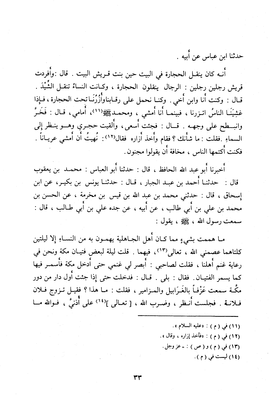 قَالَ: وَكُنْتُ أَنَا وَابْنُ أَخِي. وَكُنَّا نَحْمِلُ عَلَى رِقَابِنَا وَأُزُرُنَا تَحْتَ الْحِجَارَةِ، فَإِذَا غَشِيَنَا النَّاسَ اتَّزَرْنَا، فَبَيْنَمَا أَنَا أَمْشِي، وَمُحَمَّدٌ صَلَّى اللهُ عَلَيْهِ وآله وَسَلَّمَ [ (11) ] ، أَمَامِي، قَالَ: فَخَرَّ وانْبَطَحَ عَلَى وَجْهِهِ. قَالَ: فَجِئْتُ أَسْعَى، وَأَلْقَيْتُ حَجَرِي وَهُوَ يَنْظُرُ إِلَى السَّمَاءِ. فَقُلْتُ: مَا شَأْنُكَ؟ فَقَامَ وَأَخَذَ إِزَارَهُ فَقَالَ [ (12) ] : نُهِيتُ أَنْ أَمْشِيَ عُرْيَانًا.