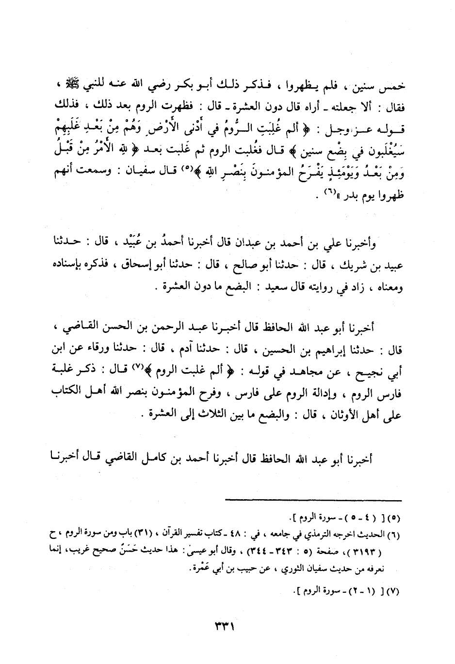أَخْبَرَنَا أَبُو عَبْدِ اللهِ الْحَافِظُ قَالَ أَخْبَرَنَا عَبْدُ الرَّحْمَنِ بْنُ الْحَسَنِ الْقَاضِي، قَالَ: حَدَّثَنَا إِبْرَاهِيمُ بْنُ الْحُسَيْنِ، قَالَ: حَدَّثَنَا آدَمُ، قَالَ: حَدَّثَنَا وَرْقَاءُ عَنِ ابْنِ أَبِي نَجِيحٍ، عَنْ مُجَاهِدٍ فِي قَوْلِهِ: الم غُلِبَتِ الرُّومُ [ (7) ] قَالَ: ذَكَرَ غَلَبَةَ فَارِسَ الرُّومَ، وَإِدَالَةَ الرُّومِ عَلَى فَارِسَ، وَفَرِحَ الْمُؤْمِنُونَ بِنَصْرِ اللهِ أَهْلَ الْكِتَابِ عَلَى أَهْلِ الْأَوْثَانِ، قَالَ: وَالْبِضْعُ مَا بَيْنَ الثَّلَاثِ إِلَى الْعَشَرَةِ.