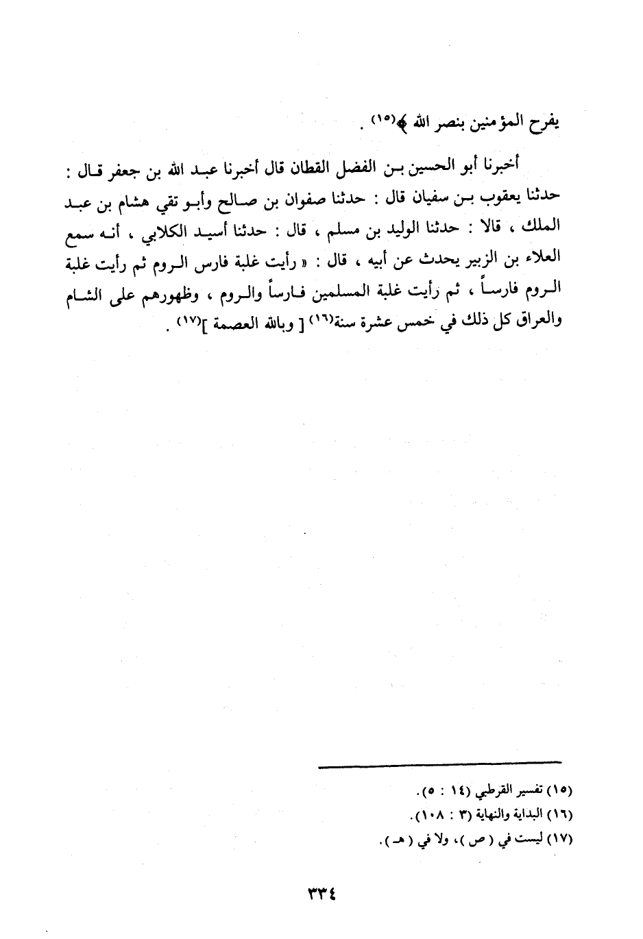 حَدَّثَنَا يَعْقُوبُ بْنُ سُفْيَانَ قَالَ: حَدَّثَنَا صَفْوَانُ بْنُ صَالِحٍ وَأَبُو تَقِيٍّ هِشَامُ بْنُ عَبْدِ الْمَلِكِ، قَالَا: حَدَّثَنَا الْوَلِيدُ بْنُ مُسْلِمٍ، قَالَ: حَدَّثَنَا أُسَيْدٌ الْكِلَابِيُّ، أَنَّهُ سَمِعَ الْعَلَاءَ بْنَ الزُّبَيْرِ يُحَدِّثُ عَنْ أَبِيهِ، قَالَ: «رَأَيْتُ غَلَبَةَ فَارِسَ الرُّومَ ثُمَّ رأيت غلبة الروم فارسا، ثُمَّ رَأَيْتُ غَلَبَةَ الْمُسْلِمِينَ فارسا وَالرُّومَ، وَظُهُورَهُمْ عَلَى الشَّامِ وَالْعِرَاقِ كُلُّ ذَلِكَ فِي خَمْسَ عَشْرَةَ سَنَةً [ (16) ] [وَبِاللهِ العصمة] [ (17) ] .