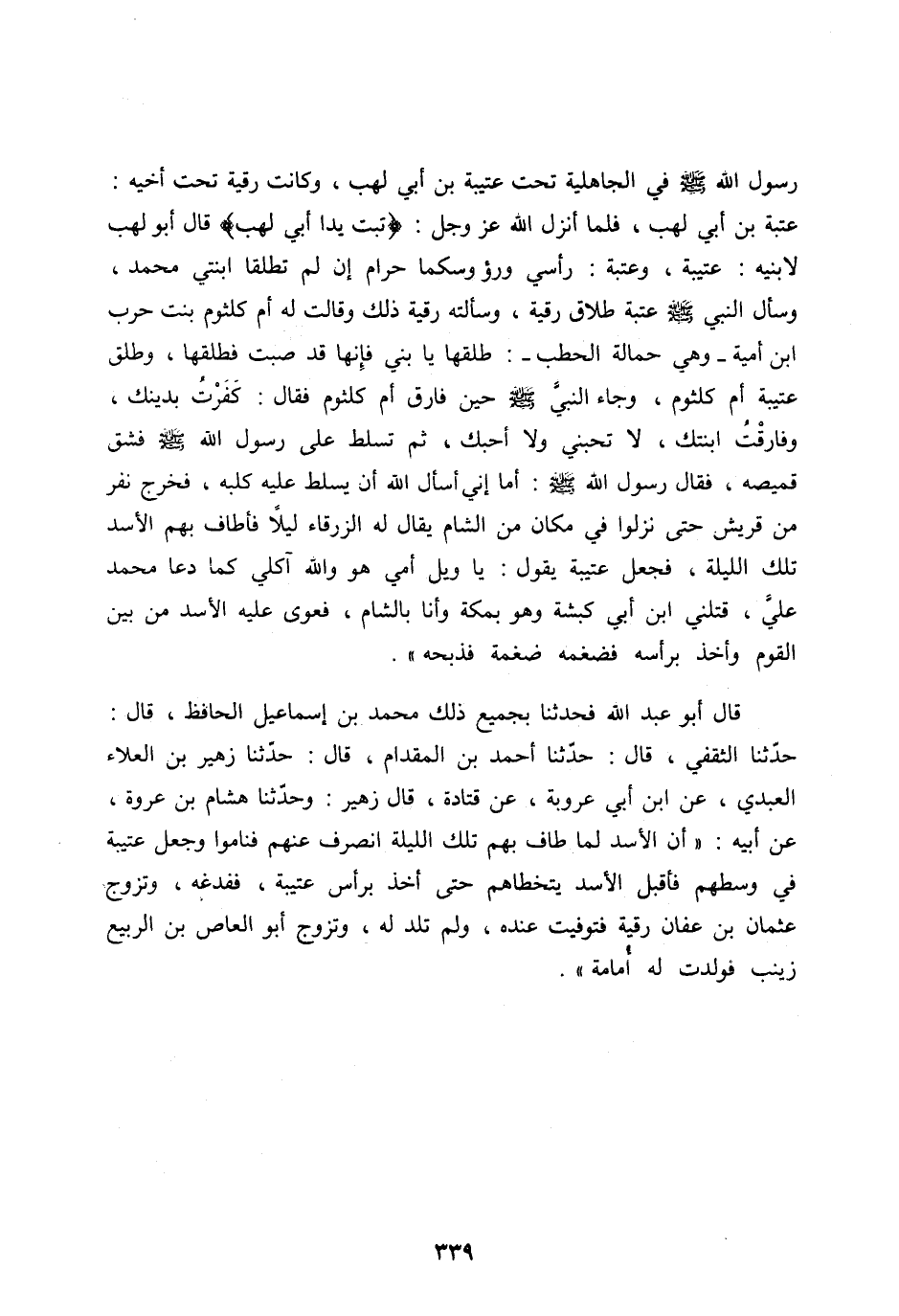 عُتْبَةَ بْنِ أَبِي لَهَبٍ، فَلَمَّا أَنْزَلَ اللهُ عَزَّ وَجَلَّ: تَبَّتْ يَدا أَبِي لَهَبٍ قَالَ أَبُو لَهَبٍ لِابْنَيهِ: عتيبة، وعتبة: رأسي ورؤوسكما حَرَامٌ إِنْ لَمْ تُطَلِّقَا ابْنَتَيْ مُحَمَّدٍ، وَسَأَلَ النَّبِيُّ صَلَّى اللهُ عليه وآله وَسَلَّمَ عُتْبَةَ طَلَاقَ رُقَيَّةَ، وَسَأَلَتْهُ رُقَيَّةُ ذَلِكَ وَقَالَتْ لَهُ أُمُّ كُلْثُومِ بِنْتُ حرب ابن أُمَيَّةَ- وَهِيَ حَمَّالَةُ الْحَطَبِ-: طَلِّقْهَا يَا بُنَيَّ فَإِنَّهَا قَدْ صَبَتْ فَطَلَّقَهَا، وَطَلَّقَ عُتَيْبَةُ أُمَّ كُلْثُومٍ، وَجَاءَ النَّبِيُّ صَلَّى اللهُ عليه وآله وَسَلَّمَ حِينَ فَارَقَ أُمَّ كُلْثُومٍ فَقَالَ: كَفَرْتُ بِدِينِكَ، وَفَارَقْتُ ابْنَتَكَ، لَا تُحِبُّنِي وَلَا أُحِبُّكَ، ثُمَّ تَسَلَّطَ عَلَى رَسُولِ اللهِ صَلَّى الله عليه وآله وَسَلَّمَ فَشَقَّ قَمِيصَهُ، فَقَالَ رَسُولُ اللهِ صَلَّى اللهُ عليه وآله وَسَلَّمَ: أَمَا إِنِّي أَسْأَلُ اللهَ أَنْ يُسَلِّطَ عَلَيْهِ كَلْبَهُ،
