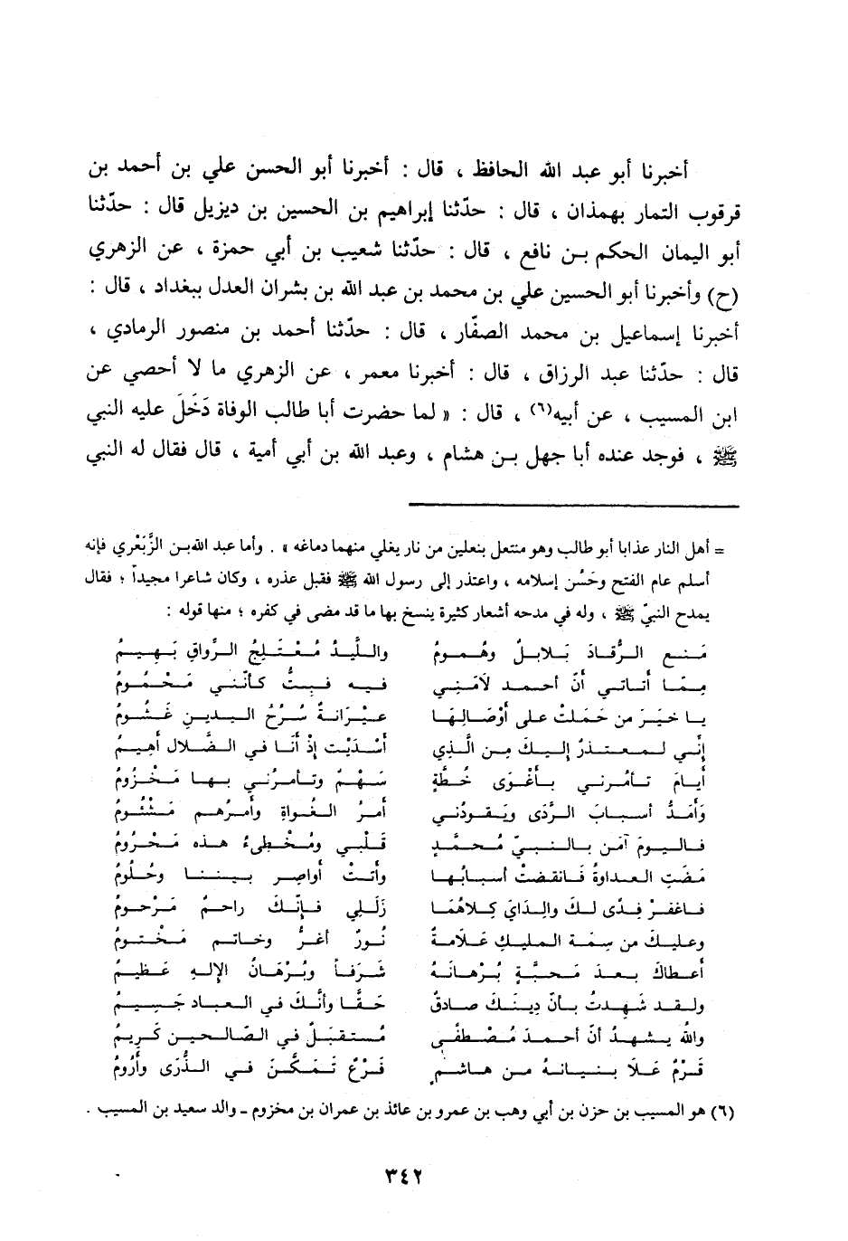 أَخْبَرَنَا إِسْمَاعِيلُ بْنُ مُحَمَّدٍ الصَّفَّارُ، قَالَ: حَدَّثَنَا أَحْمَدُ بْنُ مَنْصُورٍ الرَّمَادِيُّ، قَالَ: حَدَّثَنَا عَبْدُ الرَّزَّاقِ، قَالَ: أَخْبَرَنَا مَعْمَرٌ، عَنِ الزُّهْرِيِّ مَا لَا أُحْصِي عَنِ ابْنِ الْمُسَيِّبِ، عَنْ أَبِيهِ [ (6) ] ، قَالَ: «لَمَّا حَضَرَتْ أَبَا طَالِبٍ الْوَفَاةُ دَخَلَ عَلَيْهِ النَّبِيُّ صَلَّى اللهُ عليه وآله وَسَلَّمَ، فَوَجَدَ عِنْدَهُ أَبَا جَهْلِ بْنَ هِشَامٍ، وَعَبْدَ اللهِ بْنَ أَبِي أُمَيَّةَ، قَالَ فَقَالَ لَهُ النَّبِيُّ