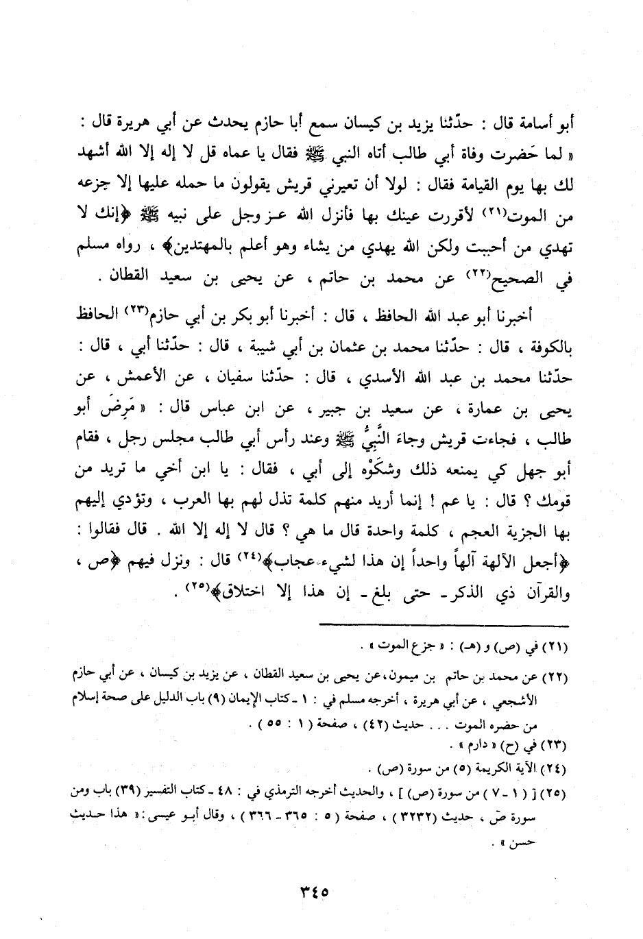 «لَمَّا حَضَرَتْ وَفَاةُ أَبِي طَالِبٍ أَتَاهُ النَّبِيُّ صَلَّى اللهُ عليه وآله وَسَلَّمَ فَقَالَ يَا عَمَّاهُ قُلْ لَا إِلَهَ إِلَّا اللهُ أَشْهَدُ لَكَ بِهَا يَوْمَ الْقِيَامَةِ فَقَالَ: لَوْلَا أَنْ تُعَيِّرَنِي قُرَيْشٌ يَقُولُونَ مَا حَمَلَهُ عَلَيْهَا إِلَّا جَزَعُهُ مِنَ الْمَوْتِ [ (21) ] لَأَقْرَرْتُ عَيْنَكَ بِهَا فَأَنْزَلَ اللهُ عَزَّ وَجَلَّ عَلَى نَبِيِّهِ صلى الله عليه وآله وَسَلَّمَ إِنَّكَ لَا تَهْدِي مَنْ أَحْبَبْتَ وَلكِنَّ اللَّهَ يَهْدِي مَنْ يَشاءُ وَهُوَ أَعْلَمُ بِالْمُهْتَدِينَ، رَوَاهُ مُسْلِمٌ فِي الصَّحِيحِ [ (22) ] عَنْ مُحَمَّدِ بْنِ حَاتِمٍ، عَنْ يَحْيَى بْنِ سَعِيدِ الْقَطَّانِ.