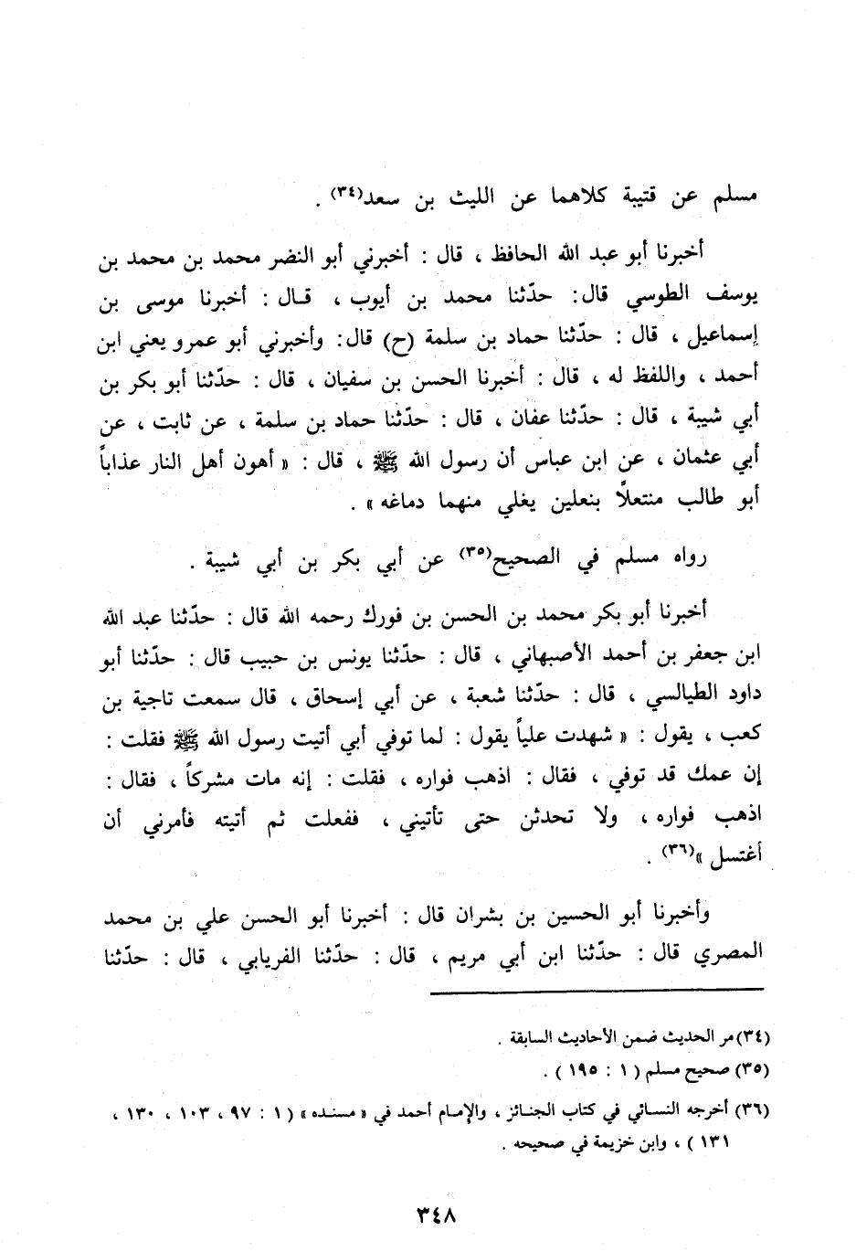 أَخْبَرَنَا أَبُو عَبْدِ اللهِ الْحَافِظُ، قَالَ: أَخْبَرَنِي أَبُو النَّضْرِ مُحَمَّدُ بْنُ مُحَمَّدِ بْنِ يُوسُفَ الطُّوسِيُّ قَالَ: حَدَّثَنَا مُحَمَّدُ بْنُ أَيُّوبَ، قَالَ: أَخْبَرَنَا مُوسَى بْنُ إِسْمَاعِيلَ، قَالَ: حَدَّثَنَا حَمَّادُ بْنُ سَلَمَةَ (ح) قَالَ: وَأَخْبَرَنِي أَبُو عَمْرِو يَعْنِي ابْنَ أَحْمَدَ، وَاللَّفْظُ لَهُ، قَالَ: أَخْبَرَنَا الْحَسَنُ بْنُ سُفْيَانَ، قَالَ: حَدَّثَنَا أَبُو بَكْرِ بْنُ أَبِي شَيْبَةَ، قَالَ: حَدَّثَنَا عَفَّانُ، قَالَ: حَدَّثَنَا حَمَّادُ بْنُ سَلَمَةَ، عَنْ ثَابِتٍ، عَنْ أَبِي عُثْمَانَ، عَنِ ابْنِ عَبَّاسٍ أَنَّ رَسُولَ اللهِ صَلَّى الله عليه وآله وَسَلَّمَ، قَالَ: «أَهْوَنُ أَهْلِ النَّارِ عَذَابًا أَبُو طَالِبٍ مُنْتَعِلًا بِنَعْلَيْنِ يَغْلِي مِنْهُمَا دِمَاغُهُ» .