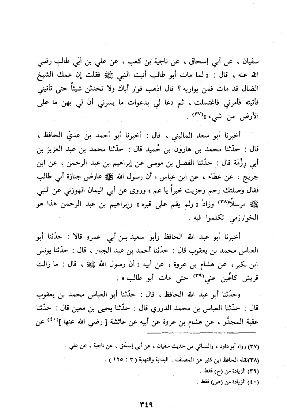 أَخْبَرَنَا أَبُو سَعْدٍ الْمَالِينِيُّ، قَالَ: أَخْبَرَنَا أَبُو أَحْمَدَ بْنُ عَدِيِّ الْحَافِظُ، قَالَ: حَدَّثَنَا مُحَمَّدُ بْنُ هَارُونَ بْنِ حُمَيْدٍ قَالَ: حَدَّثَنَا مُحَمَّدُ بْنُ عَبْدِ الْعَزِيزِ بْنِ أَبِي رِزْمَةَ قَالَ: حَدَّثَنَا الْفَضْلُ بْنُ مُوسَى عَنْ إِبْرَاهِيمَ بْنِ عَبْدِ الرَّحْمَنِ، عَنِ ابْنِ جُرَيْجٍ، عَنْ عَطَاءَ، عَنِ ابْنِ عَبَّاسٍ «أَنَّ رَسُولَ اللهِ صَلَّى الله عليه وآله وَسَلَّمَ عَارَضَ جَنَازَةَ أَبِي طَالِبٍ فَقَالَ وَصَلَتْكَ رَحِمٌ وَجُزِيتَ خَيْرًا يَا عَمِّ» وَرَوَى عَنْ أَبِي الْيَمَانِ الْهَوْزَنِيِّ عَنِ النَّبِيِّ صَلَّى اللهُ عليه وآله وَسَلَّمَ مُرْسَلًا [ (38) ] وَزَادَ «وَلَمْ يَقُمْ عَلَى قَبْرِهِ» وَإِبْرَاهِيمُ بْنُ عَبْدِ الرَّحْمَنِ هَذَا هُوَ الْخَوَارَزْمِيُّ تَكَلَّمُوا فِيهِ.
