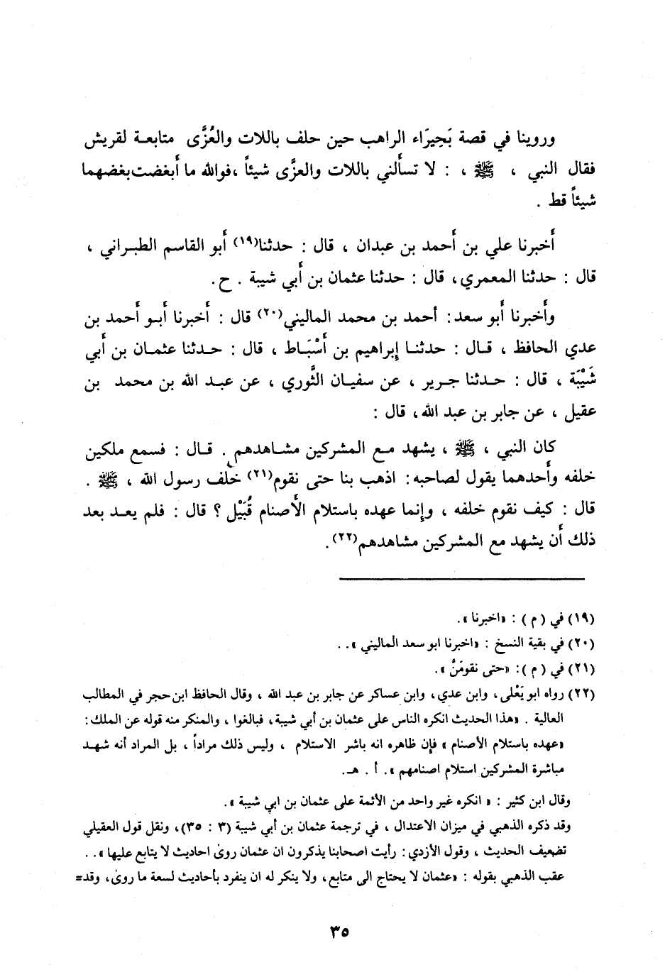 وَرُوِّينَِا فِي قِصَّةِ بَحِيرَاءَ الرَّاهِبِ حِينَ حَلَفَ بِاللَّاتِ وَالْعُزَّى مُتَابَعَةً لِقُرَيْشٍ، فَقَالَ النَّبِيُّ، صَلَّى اللهُ عَلَيْهِ وآله وَسَلَّمَ،: لَا تَسْأَلْنِي بِاللَّاتِ والعزّى شيئا، فو الله مَا أَبْغَضْتُ بُغْضَهُمَا شَيْئًا قَطُّ.