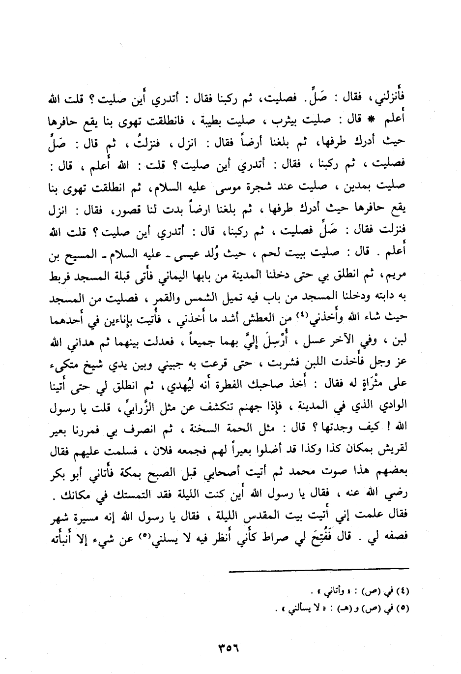 صَلَّيْتَ بِمَدْيَنَ، صَلَّيْتَ عِنْدَ شَجَرَةِ مُوسَى عَلَيْهِ السَّلَامُ، ثُمَّ انْطَلَقَتْ تَهْوَى بِنَا يَقَعُ حَافِرُهَا حَيْثُ أَدْرَكَ طَرْفُهَا، ثُمَّ بَلَغْنَا أَرْضًا بَدَتْ لَنَا قُصُورٌ، فَقَالَ: انْزِلْ فَنَزَلَتُ فَقَالَ: صَلِّ فَصَلَّيْتُ، ثُمَّ رَكِبْنَا، قَالَ: أَتَدْرِي أَيْنَ صَلَّيْتَ؟ قُلْتُ اللهُ أَعْلَمُ. قَالَ: صَلَّيْتَ بِبَيْتِ لَحْمٍ، حَيْثُ وُلِدَ عِيسَى- عَلَيْهِ السَّلَامُ- المسيح بن مَرْيَمَ، ثُمَّ انْطَلَقَ بِي حَتَّى دَخَلْنَا الْمَدِينَةَ مِنْ بَابِهَا الْيَمَانِيِّ فَأَتَى قِبْلَةَ الْمَسْجِدِ فَرَبَطَ بِهِ دَابَّتَهُ وَدَخَلْنَا الْمَسْجِدَ مِنْ بَابٍ فِيهِ تَمِيلُ الشَّمْسُ وَالْقَمَرُ، فَصَلَّيْتُ مِنَ الْمَسْجِدِ حَيْثُ شَاءَ اللهُ وَأَخَذَنِي [ (4) ] مِنَ الْعَطَشِ أَشَدُّ مَا أَخَذَنِي، فَأُتِيتُ بِإِنَاءَيْنِ فِي أَحَدِهِمَا لَبَنٌ، وَفِي الْآخَرِ عَسَلٌ، أُرْسِلَ إِلَيَّ بِهِمَا جَمِيعًا، فَعَدَلْتُ بَيْنَهُمَا ثُمَّ هَدَانِي اللهُ عَزَّ وَجَلَّ فَأَخَذْتُ اللَّبَنَ فَشَرِبْتُ، حَتَّى قَرَعْتُ بِهِ جَبِينِي وَبَيْنَ يَدَيَّ شَيْخٌ مُتَّكِئٌ عَلَى مَثْرَاةٍ لَهُ فَقَالَ: أَخَذَ صَاحِبُكَ الْفِطْرَةَ إِنَّهُ لَيُهْدَى، ثُمَّ انْطَلَقَ لي حَتَّى أَتَيْنَا الْوَادِي الَّذِي فِي الْمَدِينَةِ، فَإِذَا جَهَنَّمُ تَنْكَشِفُ عَنْ مِثْلِ الزَّرَابِيِّ، قُلْتُ يَا رَسُولَ اللهِ! كَيْفَ وَجَدْتَهَا؟ قَالَ: مِثْلُ الْحُمَةِ السُّخْنَةِ، ثُمَّ انْصَرَفَ بِي فَمَرَرْنَا بِعِيرٍ لِقُرَيْشٍ بِمَكَانِ كَذَا وَكَذَا قَدْ أَضَلُّوا بَعِيرًا لَهُمْ فَجَمَعَهُ فُلَانٌ، فَسَلَّمْتُ عَلَيْهِمْ فَقَالَ بَعْضُهُمْ هَذَا صَوْتُ مُحَمَّدٍ ثُمَّ أَتَيْتُ أَصْحَابِي قَبْلَ الصُّبْحِ بِمَكَّةَ فَأَتَانِي أَبُو بَكْرٍ رَضِيَ اللهُ عَنْهُ، فَقَالَ يَا رَسُولَ اللهِ أَيْنَ كُنْتَ اللَّيْلَةَ فَقَدِ الْتَمَسْتُكَ فِي مَكَانِكَ.