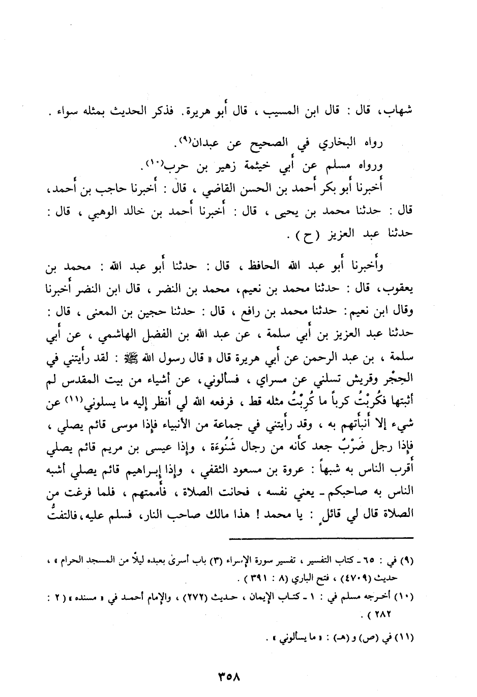 حَدَّثَنَا عَبْدُ الْعَزِيزِ بْنُ أَبِي سَلَمَةَ، عَنْ عَبْدِ اللهِ بْنِ الْفَضْلِ الْهَاشِمِيِّ، عَنْ أَبِي سَلَمَةَ، بْنِ عَبْدِ الرَّحْمَنِ عَنْ أَبِي هُرَيْرَةَ قَالَ «قَالَ رَسُولُ اللهِ صَلَّى اللهُ عليه وآله وَسَلَّمَ: لَقَدْ رَأَيْتُنِي فِي الْحِجْرِ وَقُرَيْشٌ تَسَلْنِي عَنْ مَسْرَايَ، فَسَأَلُونِي، عَنْ أَشْيَاءَ مِنْ بَيْتِ الْمَقْدِسِ لَمْ أُثْبِتْهَا فَكُرِبْتُ كَرْبًا مَا كُرِبْتُ مِثْلَهُ قَطُّ، فَرَفَعَهُ اللهُ لِي أَنْظُرُ إِلَيْهِ مَا يَسَلُونِي [ (11) ] عَنْ شَيْءٍ إِلَّا أَنْبَأْتُهُمْ بِهِ، وَقَدْ رَأَيْتُنِي فِي جَمَاعَةٍ مِنَ الْأَنْبِيَاءِ فَإِذَا مُوسَى قَائِمٌ يُصَلِّي، فَإِذَا رَجُلٌ ضَرْبٌ جَعْدٌ كَأَنَّهُ مِنْ رِجَالِ شنوءة، وإذا عيسى بن مَرْيَمَ قَائِمٌ يُصَلِّي أَقْرَبُ النَّاسِ بِهِ شَبَهًا: عُرْوَةُ بْنُ مَسْعُودٍ الثَّقَفِيُّ، وَإِذَا إِبْرَاهِيمُ قَائِمٌ يُصَلِّي أَشْبَهُ النَّاسِ بِهِ صَاحِبُكُمْ- يَعْنِي نَفْسَهُ، فَحَانَتِ الصَّلَاةُ، فَأَمَمْتُهُمْ، فَلَمَّا فَرَغْتُ مِنَ الصَّلَاةِ قَالَ لِي قَائِلٌ: يَا مُحَمَّدُ! هَذَا مَالِكٌ صَاحِبُ النَّارِ، فَسَلِّمْ عَلَيْهِ، فَالْتَفَتُّ