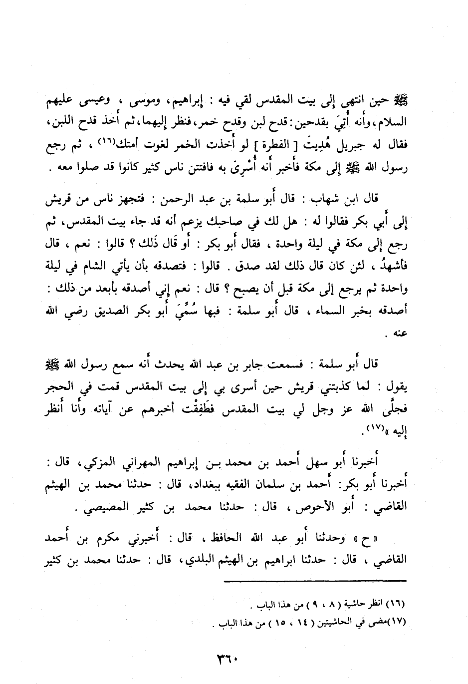 قَالَ أَبُو سَلَمَةَ: فَسَمِعْتُ جَابِرَ بْنَ عَبْدِ اللهِ يُحَدِّثُ أَنَّهُ سَمِعَ رَسُولَ اللهِ صَلَّى اللهُ عَلَيْهِ وآله وَسَلَّمَ يَقُولُ: لَمَّا كَذَّبَتْنِي قُرَيْشٌ حِينَ أُسْرِيَ بِي إِلَى بَيْتِ الْمَقْدِسِ قُمْتُ فِي الْحِجْرِ فَجَلَّى اللهُ عَزَّ وَجَلَّ لِي بَيْتَ المقدس فطفقت أخبرهم عن آيَاتِهِ وَأَنَا أَنْظُرُ إِلَيْهِ» [ (17) ] .
