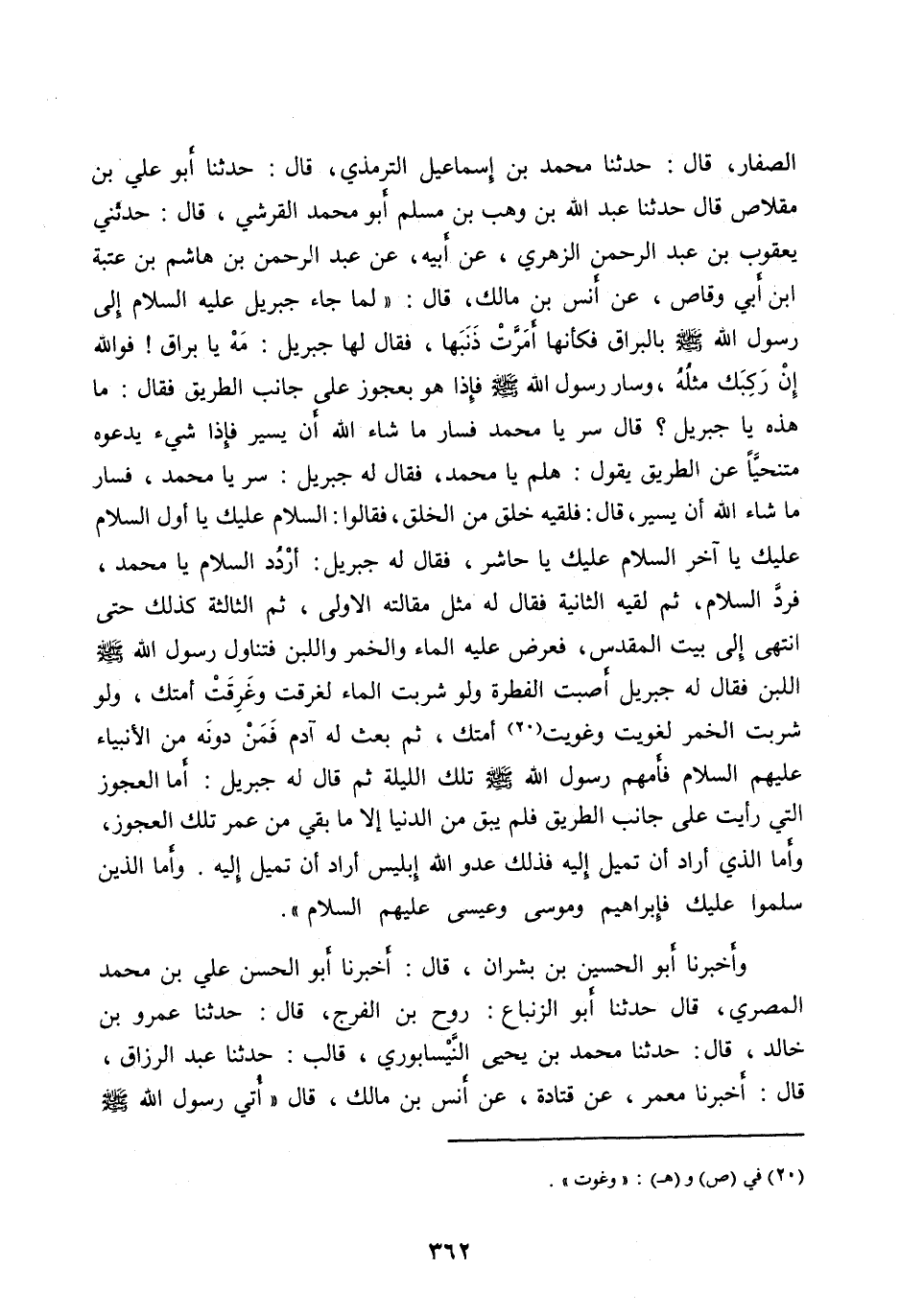 الصَّفَّارُ، قَالَ: حَدَّثَنَا مُحَمَّدُ بْنُ إِسْمَاعِيلَ التِّرْمِذِيُّ، قَالَ: حَدَّثَنَا أَبُو عَلِيِّ بْنُ مِقْلَاصٍ قَالَ حَدَّثَنَا عَبْدُ اللهِ بْنُ وَهْبِ بْنِ مُسْلِمٍ أَبُو مُحَمَّدٍ الْقُرَشِيُّ، قَالَ: حَدَّثَنِي يَعْقُوبُ بْنُ عَبْدِ الرَّحْمَنِ الزُّهْرِيُّ، عَنْ أَبِيهِ، عَنْ عَبْدِ الرَّحْمَنِ بْنِ هَاشِمِ بْنِ عُتْبَةَ ابْنِ أَبِي وَقَّاصٍ، عَنْ أَنَسِ بْنِ مَالِكٍ، قَالَ: «لَمَّا جَاءَ جِبْرِيلُ عَلَيْهِ السَّلَامُ إِلَى رَسُولِ اللهِ صلى الله عليه وآله وَسَلَّمَ بِالْبُرَاقِ فَكَأَنَّهَا أَمَرَّتْ ذَنَبَهَا، فَقَالَ لَهَا جِبْرِيلُ: مه يا براق! فو الله إِنْ رَكِبَكَ مِثْلُهُ، وَسَارَ رَسُولُ اللهِ صَلَّى الله عليه وآله وَسَلَّمَ فَإِذَا هُوَ بِعَجُوزٍ عَلَى جَانِبِ الطَّرِيقِ فَقَالَ: مَا هَذِهِ يَا جِبْرِيلُ؟ قَالَ سِرْ يَا مُحَمَّدُ فَسَارَ مَا شَاءَ اللهُ أَنْ يَسِيرَ فَإِذَا شَيْءٌ يَدْعُوهُ مُتَنَحِّيًا عَنِ الطَّرِيقِ يَقُولُ: هَلُمَّ يَا مُحَمَّدُ، فَقَالَ لَهُ جِبْرِيلُ: سِرْ يَا مُحَمَّدُ، فَسَارَ مَا شَاءَ اللهُ أَنْ يَسِيرَ، قَالَ: فَلَقِيَهُ خَلْقٌ مِنَ الْخَلْقِ، فَقَالُوا: السَّلَامُ عَلَيْكَ يَا أَوَّلُ السَّلَامُ عَلَيْكَ يَا آخِرُ السَّلَامُ عَلَيْكَ يَا حَاشِرُ، فَقَالَ لَهُ جِبْرِيلُ: ارْدُدِ السَّلَامَ يَا مُحَمَّدُ، فَرَدَّ السَّلَامَ، ثُمَّ لَقِيَهُ الثَّانِيَةَ فَقَالَ لَهُ مِثْلَ مَقَالَتِهِ الْأُولَى، ثُمَّ الثَّالِثَةَ كَذَلِكَ حَتَّى انْتَهَى إِلَى بَيْتِ الْمَقْدِسِ، فَعُرِضَ عَلَيْهِ الْمَاءُ وَالْخَمْرُ وَاللَّبَنُ فَتَنَاوَلَ رَسُولُ اللهِ صَلَّى الله عليه وآله وَسَلَّمَ اللَّبَنَ فَقَالَ لَهُ جِبْرِيلُ أَصَبْتَ الْفِطْرَةَ وَلَوْ شَرِبْتَ الْمَاءَ لَغَرِقْتَ وَغَرِقَتْ أُمَّتُكَ، وَلَوْ شَرِبْتَ الْخَمْرَ لَغَوَيْتَ وَغَوِيَتْ [ (20) ] أُمَّتُكَ، ثُمَّ بُعِثَ لَهُ آدَمُ فَمَنْ دُونَهُ مِنَ الْأَنْبِيَاءِ عَلَيْهِمُ السَّلَامُ فَأَمَّهُمْ رَسُولُ اللهِ صلى الله عليه وآله وَسَلَّمَ تِلْكَ اللَّيْلَةُ ثُمَّ قَالَ لَهُ جِبْرِيلُ: أَمَّا الْعَجُوزُ الَّتِي رَأَيْتَ عَلَى جَانِبِ الطَّرِيقِ فَلَمْ يَبْقَ مِنَ الدُّنْيَا إِلَّا مَا بَقِيَ مِنْ عُمُرِ تِلْكَ الْعَجُوزِ، وَأَمَّا الَّذِي أَرَادَ أَنْ تَمِيلَ إِلَيْهِ فَذَلِكَ عَدُوُّ اللهِ إِبْلِيسُ أَرَادَ أَنْ تَمِيلَ إِلَيْهِ. وَأَمَّا الَّذِينَ سَلَّمُوا عَلَيْكَ فَإِبْرَاهِيمُ وَمُوسَى وَعِيسَى عَلَيْهِمُ السَّلَامُ» .