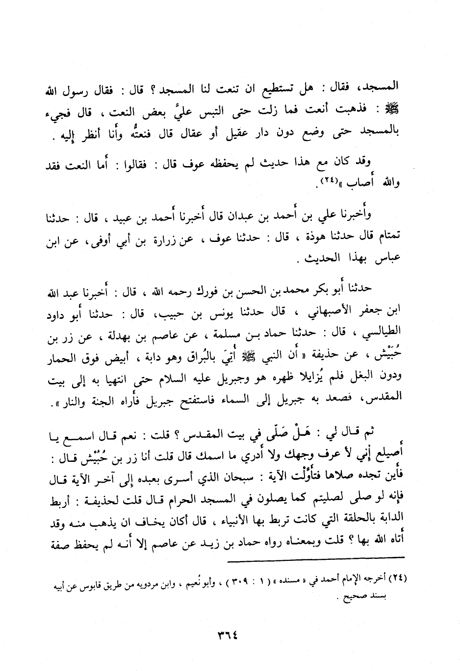 حَدَّثَنَا أَبُو بَكْرٍ مُحَمَّدُ بْنُ الْحَسَنِ بْنِ فُورَكٍ رَحِمَهُ اللهُ، قَالَ: أَخْبَرَنَا عَبْدُ اللهِ ابْنُ جَعْفَرٍ الْأَصْبَهَانِيُّ، قَالَ حَدَّثَنَا يُونُسُ بْنُ حَبِيبٍ، قَالَ: حَدَّثَنَا أَبُو دَاوُدَ الطَّيَالِسِيُّ، قَالَ: حَدَّثَنَا حَمَّادُ بْنُ مسلمة، عَنْ عَاصِمِ بْنِ بَهْدَلَةَ، عَنْ زِرِّ بْنِ حُبَيْشٍ، عَنْ حُذَيْفَةَ «أَنَّ النَّبِيَّ صَلَّى اللهُ عَلَيْهِ وآله وَسَلَّمَ أُتِيَ بِالْبُرَاقِ وَهُوَ دَابَّةٌ، أَبْيَضُ فَوْقَ الْحِمَارِ وَدُونَ الْبَغْلِ فَلَمْ يُزَايِلَا ظَهْرَهُ هُوَ وَجِبْرِيلُ عَلَيْهِ السَّلَامُ حَتَّى انْتَهَيَا بِهِ إِلَى بَيْتِ الْمَقْدِسِ، فَصَعِدَ بِهِ جِبْرِيلُ إِلَى السَّمَاءِ فَاسْتَفْتَحَ جِبْرِيلُ فَأَرَاهُ الْجَنَّةَ وَالنَّارَ» .