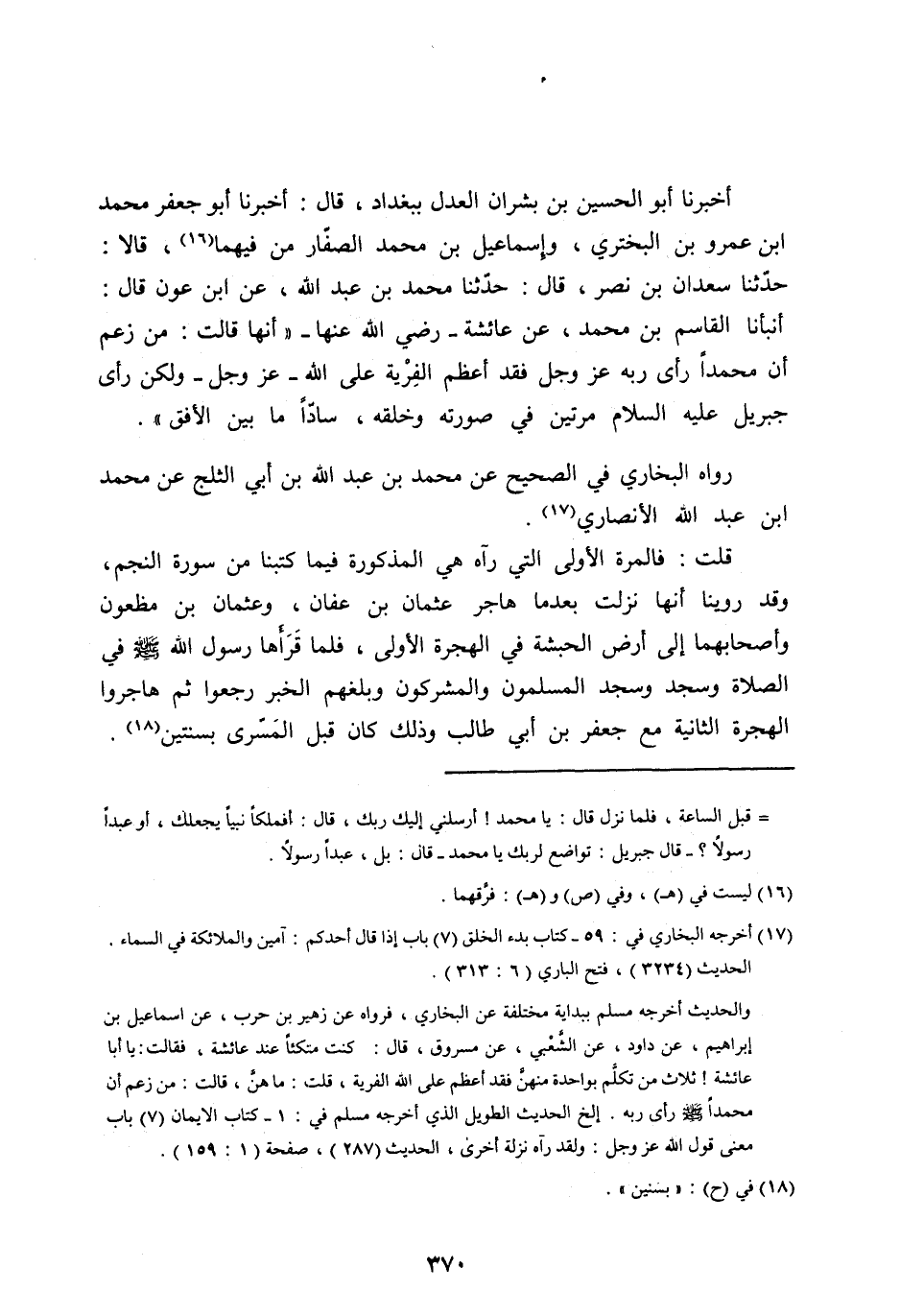 قُلْتُ: فَالْمَرَّةُ الْأُولَى الَّتِي رَآهُ هِيَ الْمَذْكُورَةُ فِيمَا كَتَبْنَا مِنْ سُورَةِ النَّجْمِ، وَقَدْ روينا أنها نزلت بعد ما هَاجَرَ عُثْمَانُ بْنُ عَفَّانَ، وَعُثْمَانُ بْنُ مَظْعُونٍ وَأَصْحَابُهُمَا إِلَى أَرْضِ الْحَبَشَةِ فِي الْهِجْرَةِ الْأُولَى، فَلَمَّا قَرَأَهَا رَسُولُ اللهِ صَلَّى الله عليه وآله وَسَلَّمَ فِي الصَّلَاةِ وَسَجَدَ وَسَجَدَ الْمُسْلِمُونَ وَالْمُشْرِكُونَ وَبَلَغَهُمُ الْخَبَرُ رَجَعُوا ثُمَّ هَاجَرُوا الْهِجْرَةَ الثَّانِيَةَ مَعَ جَعْفَرِ بْنِ أَبِي طَالِبٍ وذلك كَانَ قَبْلَ الْمَسْرَى بِسَنَتَيْنِ [ (18) ] .