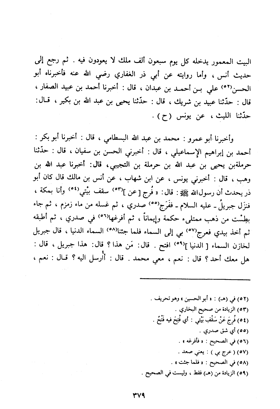 أَحْمَدُ بْنُ إِبْرَاهِيمَ الْإِسْمَاعِيلِيُّ، قَالَ: أَخْبَرَنِي الْحَسَنُ بْنُ سُفْيَانَ، قَالَ: حَدَّثَنَا حَرْمَلَةُ بْنُ يَحْيَى بْنِ عَبْدِ اللهِ بْنِ حَرْمَلَةَ بْنِ التُّجِيبِيُّ، قَالَ: أَخْبَرَنَا عَبْدُ اللهِ بْنُ وَهْبٍ، قَالَ: أَخْبَرَنِي يُونُسُ، عَنِ ابْنِ شِهَابٍ، عَنْ أَنَسِ بْنِ مَالِكٍ قَالَ كَانَ أَبُو ذَرٍّ يُحَدِّثُ أَنَّ رَسُولَ اللهِ صَلَّى اللهُ عَلَيْهِ وآله وَسَلَّمَ: قَالَ: «فُرِّجَ [عَنْ] [ (53) ] سَقْفِ بَيْتِي [ (54) ] وَأَنَا بِمَكَّةَ، فَنَزَلَ جِبْرِيلُ- عَلَيْهِ السَّلَامُ- فَفَرَجَ [ (55) ] صَدْرِي، ثُمَّ غَسَلَهُ مِنْ مَاءِ زَمْزَمَ، ثُمَّ جَاءَ بِطَسْتٍ مِنْ ذَهَبٍ مُمْتَلِئٍ حِكْمَةً وَإِيمَانًا، ثُمَّ أَفْرَغَهَا [ (56) ] فِي صَدْرِي، ثُمَّ أَطْبَقَهُ ثُمَّ أَخَذَ بِيَدِي فَعَرَجَ [ (57) ] بِي إِلَى السَّمَاءِ فَلَمَّا جِئْنَا [ (58) ] السَّمَاءَ الدُّنْيَا، قَالَ جِبْرِيلُ لِخَازِنِ السَّمَاءِ [الدُّنْيَا] [ (59) ] افْتَحْ. قَالَ: مَنْ هَذَا؟ قَالَ: هَذَا جِبْرِيلُ، قَالَ: