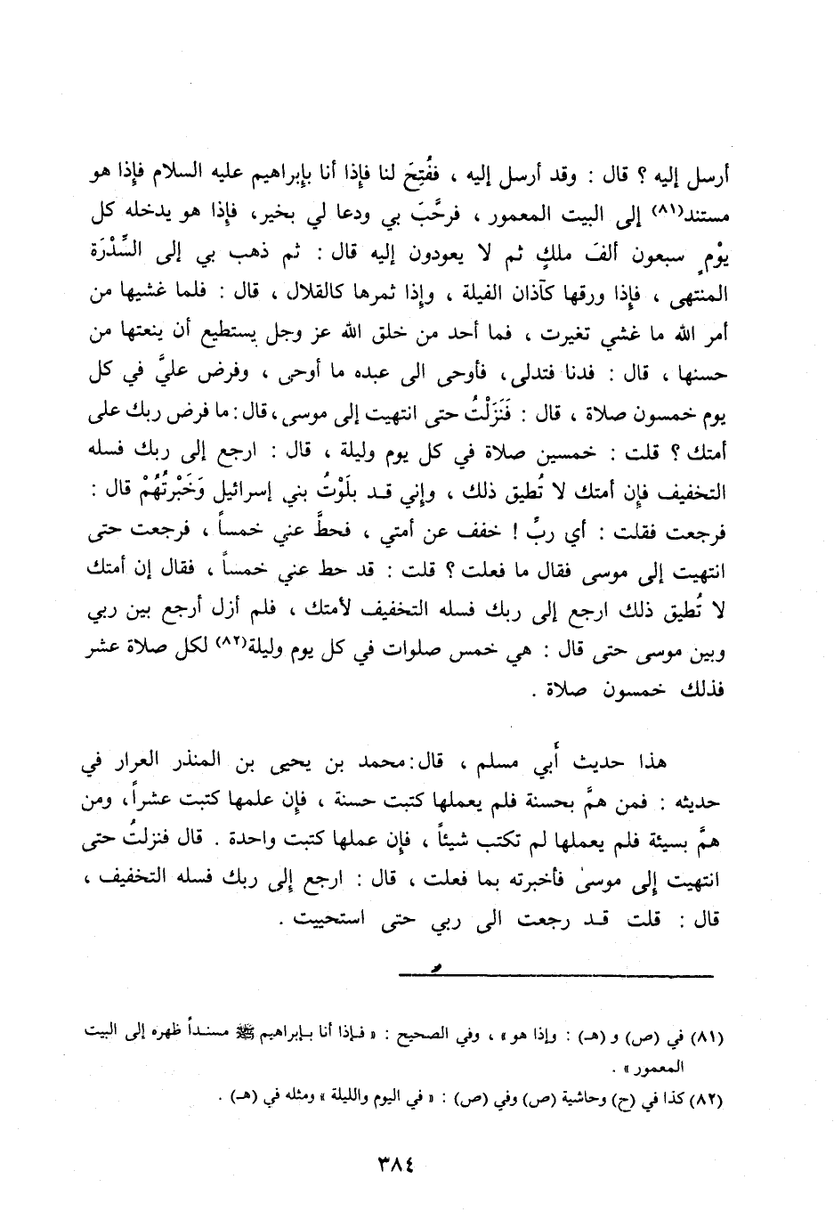 هَذَا حَدِيثُ أَبِي مُسْلِمٍ، قَالَ: مُحَمَّدُ بْنُ يَحْيَى بْنِ الْمُنْذِرِ الْعَرَّارُ فِي حَدِيثِهِ: فَمَنْ هَمَّ بِحَسَنَةٍ فَلَمْ يَعْمَلْهَا كُتِبَتْ حَسَنَةً، فإن علمها كُتِبَتْ عَشْرًا، وَمَنْ هَمَّ بِسَيِّئَةٍ فَلَمْ يَعْمَلْهَا لَمْ تُكْتَبْ شَيْئًا، فَإِنْ عَمِلَهَا كُتِبَتْ وَاحِدَةً. قَالَ فَنَزَلْتُ حَتَّى انْتَهَيْتُ إِلَى مُوسَى فَأَخْبَرْتُهُ بِمَا فَعَلْتُ، قَالَ: ارْجِعْ إِلَى رَبِّكَ فَسَلْهُ التَّخْفِيفَ، قَالَ: قُلْتُ قَدْ رَجَعْتُ إِلَى رَبِّي حَتَّى استحييت.