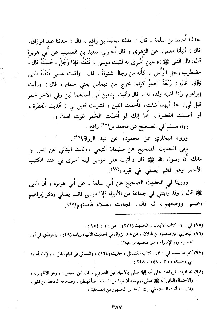 حَدَّثَنَا أَحْمَدُ بْنُ سَلَمَةَ، قَالَ: حَدَّثَنَا مُحَمَّدُ بْنُ رَافِعٍ، قَالَ: حَدَّثَنَا عَبْدُ الرَّزَّاقِ، قَالَ: أَنْبَأَنَا مَعْمَرٌ، عَنِ الزُّهْرِيِّ، قَالَ أَخْبَرَنِي سَعِيدُ بْنُ الْمُسَيِّبِ عَنْ أَبِي هُرَيْرَةَ قَالَ: قَالَ النَّبِيُّ صَلَّى الله عليه وآله وَسَلَّمَ: «حِينَ أُسْرِيَ بِهِ لَقِيتُ مُوسَى، فَنَعَتَهُ فَإِذَا رَجُلٌ- حَسِبْتُهُ قَالَ- مُضْطَرِبٌ رَجِلُ الرَّأْسِ، كَأَنَّهُ مِنْ رِجَالِ شَنُوءَةَ، قَالَ: وَلَقِيتُ عِيسَى فَنَعَتَهُ النَّبِيُّ صَلَّى الله عليه وآله وَسَلَّمَ، قَالَ: رَبْعَةٌ أَحْمَرُ كَإِنَّمَا خَرَجَ مِنْ دِيمَاسٍ يَعْنِي حَمَّامٍ، قَالَ: وَرَأَيْتُ إِبْرَاهِيمَ وَأَنَا أَشْبَهُ وَلَدِهِ بِهِ، قَالَ وَأُتِيتُ بِإِنَاءَيْنِ فِي أَحَدِهِمَا لَبَنٌ وَفِي الْآخَرِ خَمْرٌ قِيلَ لِي: خُذْ أَيَّهُمَا شِئْتَ، فَأَخَذْتُ اللَّبَنَ، فَشَرِبْتُ فَقِيلَ لِي: هُدِيتَ الْفِطْرَةَ، أَوْ أَصَبْتَ الْفِطْرَةَ، أَمَا إِنَّكَ لَوْ أَخَذْتَ الْخَمْرَ غَوَتْ أُمَّتُكَ» .
