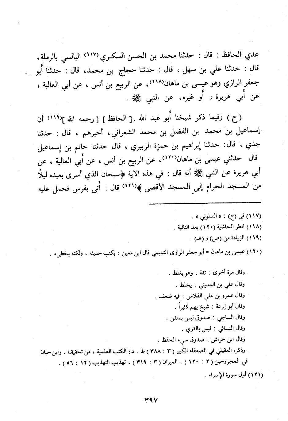 (ح) وفِيمَا ذَكَرَ شَيْخُنَا أَبُو عَبْدِ اللهِ. [الْحَافِظُ] [رَحِمَهُ اللهُ] [ (119) ] أَنَّ إِسْمَاعِيلَ بْنَ مُحَمَّدِ بْنِ الْفَضْلِ بْنِ مُحَمَّدٍ الشَّعْرَانِيَّ، أَخْبَرَهُمْ، قَالَ: حَدَّثَنَا جَدِّي، قَالَ: حَدَّثَنَا إِبْرَاهِيمُ بْنُ حَمْزَةَ الزُّبَيْرِيُّ، قَالَ حَدَّثَنَا حَاتِمُ بْنُ إِسْمَاعِيلَ، قَالَ حَدَّثَنِي عِيسَى بْنُ مَاهَانَ [ (120) ] ، عَنِ الرَّبِيعِ بْنِ أَنَسٍ، عَنْ أَبِي الْعَالِيَةِ، عَنْ أَبِي هُرَيْرَةَ عَنِ النَّبِيِّ صَلَّى اللهُ عليه وآله وَسَلَّمَ أَنَّهُ قَالَ: فِي هَذِهِ الْآيَةِ سُبْحانَ الَّذِي أَسْرى بِعَبْدِهِ لَيْلًا مِنَ الْمَسْجِدِ الْحَرامِ إِلَى الْمَسْجِدِ الْأَقْصَى [ (121) ] قَالَ: أُتِيَ بِفَرَسٍ فَحُمِلَ عليه