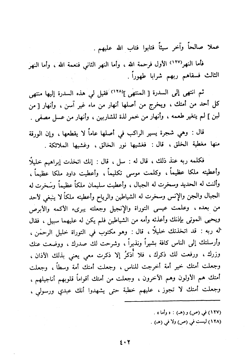 ثُمَّ انْتَهَى إِلَى السِّدْرَةِ [الْمُنْتَهَى] [ (128) ] فَقِيلَ لِي هَذِهِ السِّدْرَةُ إِلَيْهَا مُنْتَهَى كُلِّ أَحَدٍ مِنْ أُمَّتِكَ، وَيَخْرُجُ مِنْ أَصْلِهَا أَنْهَارٌ مِنْ مَاءٍ غَيْرِ آسِنٍ، وأنهار [من لبن] لم يتغير طعمه، وأنهار من خمر لذة للشاربين، وأنهار مِنْ عَسَلٍ مُصَفًّى.