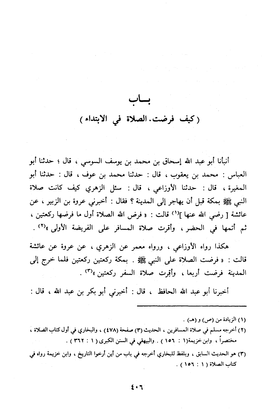 أَنْبَأَنَا أَبُو عَبْدِ اللهِ إِسْحَاقُ بْنُ مُحَمَّدِ بْنِ يُوسُفَ السُّوسِيُّ، قَالَ، حَدَّثَنَا أَبُو الْعَبَّاسِ: مُحَمَّدُ بْنُ يَعْقُوبَ، قَالَ: حَدَّثَنَا مُحَمَّدُ بْنُ عَوْفٍ، قَالَ: حَدَّثَنَا أَبُو الْمُغِيرَةِ، قَالَ: حَدَّثَنَا الْأَوْزَاعِيُّ، قَالَ: سُئِلَ الزُّهْرِيُّ كَيْفَ كَانَتْ صَلَاةُ النَّبِيِّ صَلَّى اللهُ عليه وآله وَسَلَّمَ بِمَكَّةَ قَبْلَ أَنْ يُهَاجِرَ إِلَى الْمَدِينَةِ؟ فَقَالَ: أَخْبَرَنِي عُرْوَةُ بْنُ الزُّبَيْرِ، عَنْ عَائِشَةَ [رَضِيَ اللهُ عَنْهَا] [ (1) ] قَالَتْ: «فَرَضَ اللهُ الصَّلَاةَ أَوَّلَ مَا فَرَضَهَا رَكْعَتَيْنِ، ثُمَّ أَتَمَّهَا فِي الْحَضَرِ، وَأُقِرَّتْ صَلَاةُ الْمُسَافِرِ عَلَى الْفَرِيضَةِ الْأُولَى» [ (2) ] .