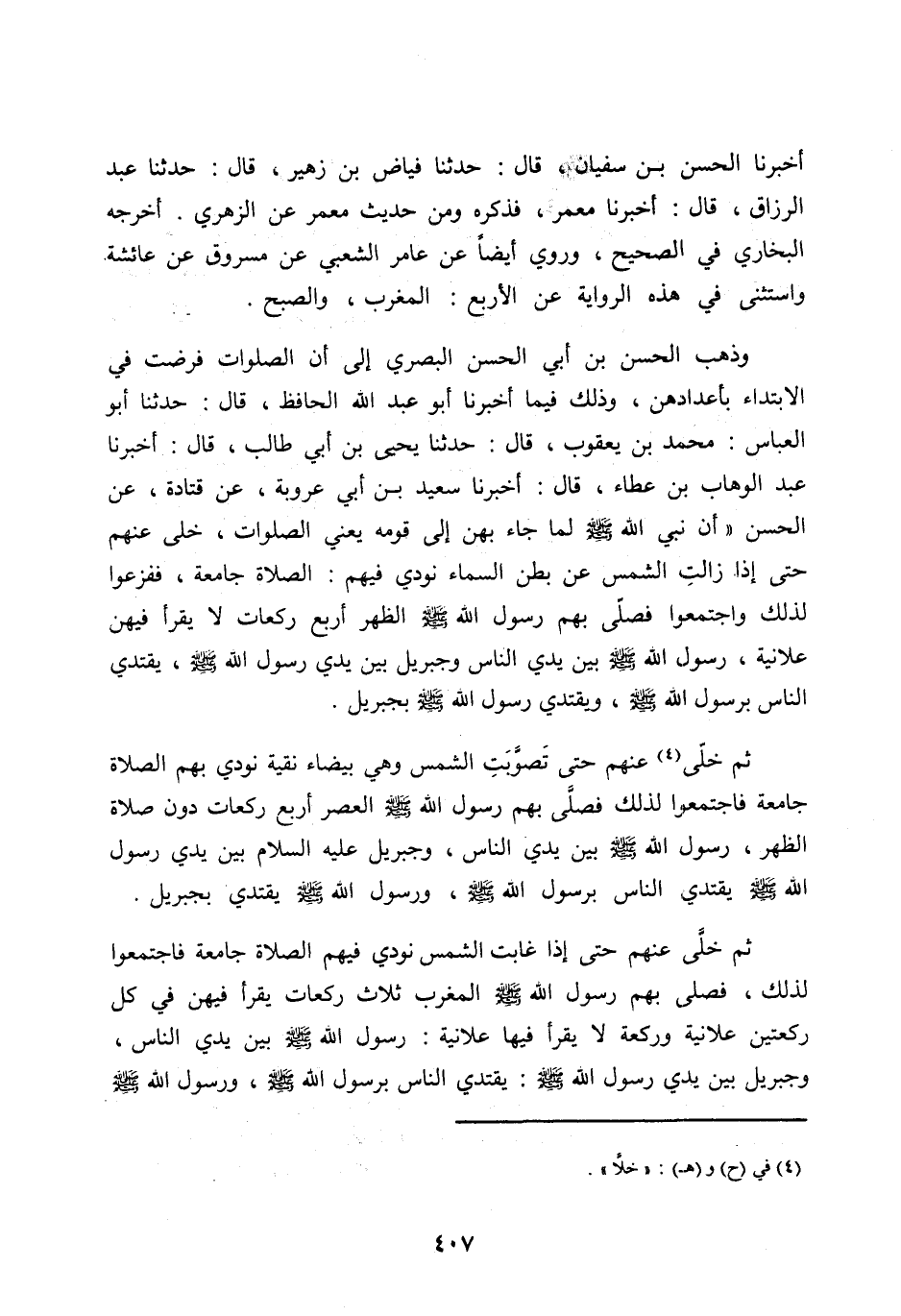 أَخْبَرَنَا الْحَسَنُ بْنُ سُفْيَانَ، قَالَ: حَدَّثَنَا فَيَّاضُ بْنُ زُهَيْرٍ، قَالَ: حَدَّثَنَا عَبْدُ الرَّزَّاقِ، قَالَ: أَخْبَرَنَا مَعْمَرٌ، فَذَكَرَهُ وَمِنْ حَدِيثِ مَعْمَرٍ عَنِ الزُّهْرِيِّ. أَخْرَجَهُ الْبُخَارِيُّ فِي الصَّحِيحِ، وَرُوِيَ أَيْضًا عَنْ عَامِرٍ الشَّعْبِيِّ عَنْ مَسْرُوقٍ عَنْ عَائِشَةَ وَاسْتَثْنَى في هذه الرواية عن الْأَرْبَعِ: الْمَغْرِبَ، وَالصُّبْحَ.