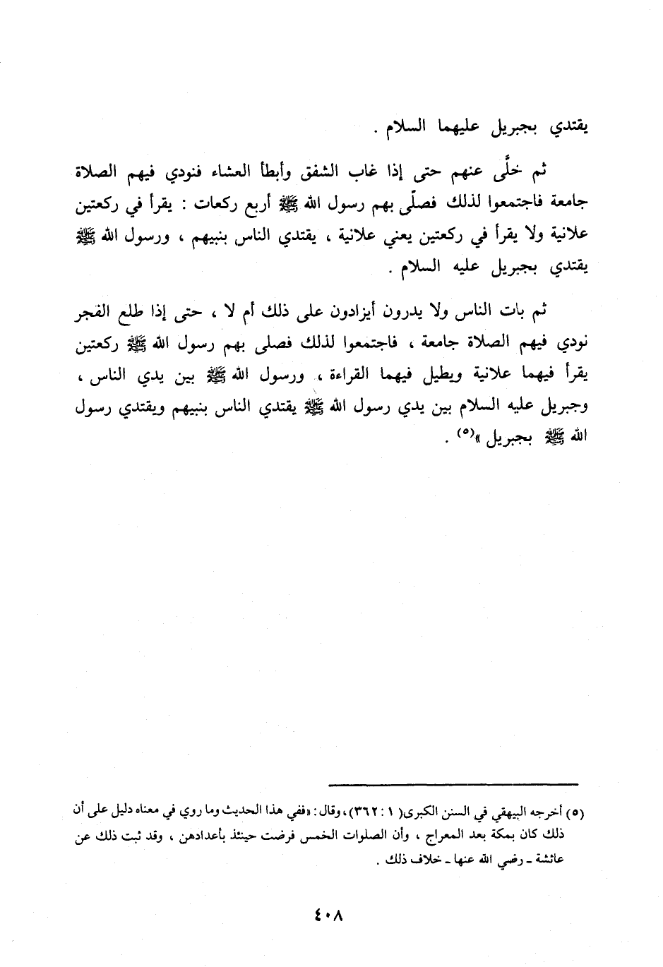 [ (5) ] أخرجه البيهقي في السنن الكبرى (1: 362) ، وقال: «ففي هذا الحديث وَمَا رُوِيَ فِي مَعْنَاهُ دليل عَلَى أَنَّ ذَلِكَ كَانَ بمكة بعد المعراج، وأن الصلوات الخمس فرضت حينئذ بأعدادهن، وقد ثبت ذلك عَنْ عَائِشَةَ- رَضِيَ اللهُ عنها- خلاف ذلك.