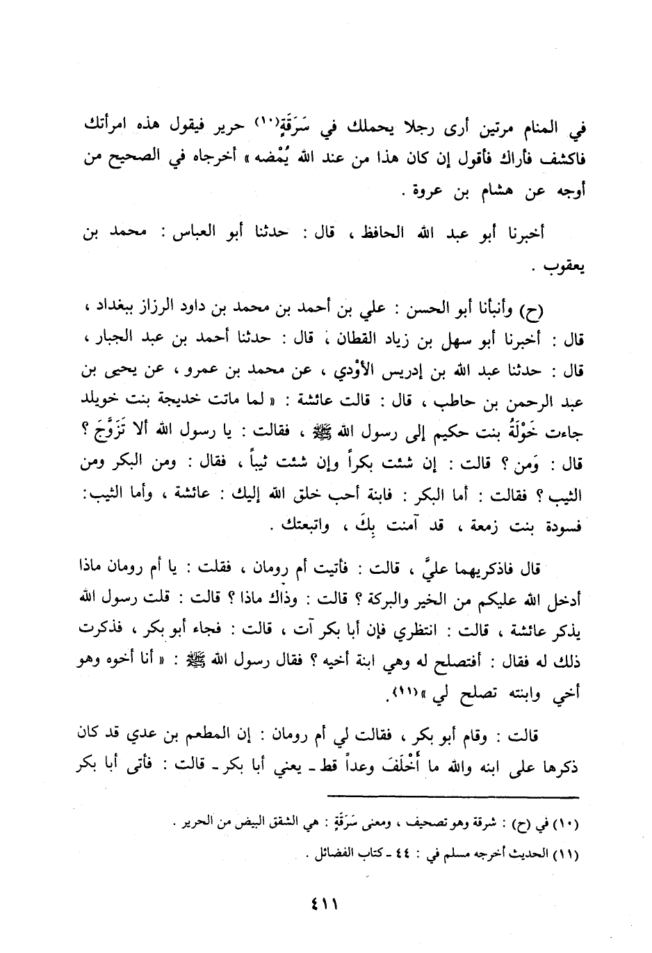 فِي الْمَنَامِ مَرَّتَيْنِ أَرَى رَجُلًا يَحْمِلُكِ فِي سَرَقَةِ [ (10) ] حَرِيرٍ فَيَقُولُ هَذِهِ امْرَأَتُكَ فَأَكْشِفُ فَأَرَاكِ فَأَقُولُ إِنْ كَانَ هَذَا مِنْ عِنْدِ اللهِ يُمْضِهِ» أَخْرَجَاهُ فِي الصَّحِيحِ مِنْ أَوْجُهٍ عَنْ هِشَامِ بْنِ عُرْوَةَ.