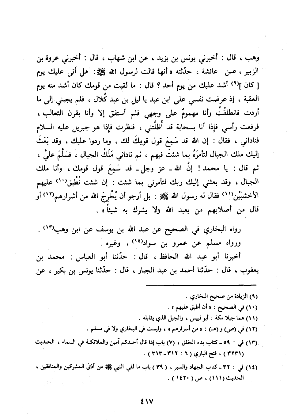 وَهْبٍ، قَالَ: أَخْبَرَنِي يُونُسُ بْنُ يَزِيدَ، عَنِ ابْنِ شِهَابٍ، قَالَ: أَخْبَرَنِي عُرْوَةُ بْنُ الزُّبَيْرِ، عَنْ عَائِشَةَ، حَدَّثَتْهُ «أَنَّهَا قَالَتْ لِرَسُولِ اللهِ صَلَّى اللهُ عليه وآله وَسَلَّمَ: هَلْ أَتَى عَلَيْكَ يَوْمٌ [كَانَ] [ (9) ] أَشَدَّ عَلَيْكَ مِنْ يَوْمِ أُحُدٍ؟ قَالَ: مَا لَقِيتُ مِنْ قَوْمِكِ كَانَ أَشَدَّ مِنْهُ يَوْمَ الْعَقَبَةِ، إِذْ عَرَضْتُ نَفْسِي على ابن عبد يا ليل بْنِ عَبْدِ كُلَالٍ، فَلَمْ يُجِبْنِي إِلَى مَا أَرَدْتُ فَانْطَلَقْتُ وَأَنَا مَهْمُومٌ عَلَى وَجْهِي فَلَمْ أَسْتَفِقْ إِلَّا وَأَنَا بِقَرْنِ الثَّعَالِبِ، فَرَفَعْتُ رَأْسِي فَإِذَا أَنَا بِسَحَابَةٍ قَدْ أَظَلَّتْنِي، فَنَظَرْتُ فَإِذَا هُوَ جِبْرِيلُ عَلَيْهِ السَّلَامُ فَنَادَانِي، فَقَالَ: إِنَّ اللهَ قَدْ سَمِعَ قَوْلَ قَوْمِكَ لَكَ، وَمَا رَدُّوا عَلَيْكَ، وَقَدْ بَعَثَ إِلَيْكَ مَلَكُ الْجِبَالِ لِتَأْمُرَهُ بِمَا شِئْتَ فِيهِمْ، ثُمَّ نَادَانِي مَلَكُ الْجِبَالِ، فَسَلَّمَ عَلَيَّ، ثُمَّ قَالَ: يَا مُحَمَّدُ! إِنَّ اللهَ- عَزَّ وجل- قد سَمِعَ قَوْلَ قَوْمِكَ، وَأَنَا مَلَكُ الْجِبَالِ، وَقَدْ بَعَثَنِي إِلَيْكَ رَبُّكَ لِتَأْمُرَنِي بِمَا شِئْتَ: إِنْ شِئْتَ نُطْبِقُ [ (10) ] عَلَيْهِمُ الْأَخْشَبَيْنِ [ (11) ] فَقَالَ لَهُ رَسُولُ اللهِ صَلَّى اللهُ عَلَيْهِ وآله وَسَلَّمَ: بَلْ أَرْجُو أَنْ يُخْرِجَ اللهُ مِنْ أَشْرَارِهِمْ [ (12) ] أَوْ قَالَ مِنْ أَصْلَابِهِمْ مَنْ يَعْبُدُ اللهَ وَلَا يُشْرِكُ بِهِ شَيْئًا» .