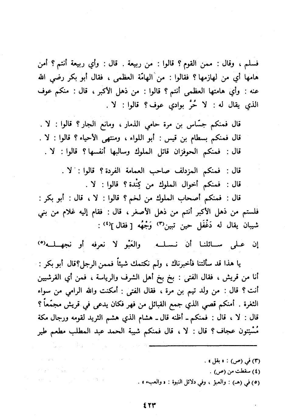 فَسَلَّمَ، وَقَالَ: مِمَّنِ الْقَوْمُ؟ قَالُوا: مِنْ رَبِيعَةَ. قَالَ: وَأَيُّ رَبِيعَةَ أَنْتُمْ؟ أَمِنْ هَامِهَا أَيْ مِنْ لَهَازِمِهَا؟ فَقَالُوا: مِنَ الْهَامَةِ الْعُظْمَى، فَقَالَ أَبُو بَكْرٍ رَضِيَ اللهُ عَنْهُ: وَأَيُّ هَامَتِهَا الْعُظْمَى أَنْتُمْ؟ قَالُوا: مِنْ ذُهْلٍ الْأَكْبَرِ، قَالَ: مِنْكُمْ عَوْفٌ الَّذِي يُقَالُ لَهُ: لَا حُرَّ بِوَادِي عَوْفٍ؟ قَالُوا: لَا.